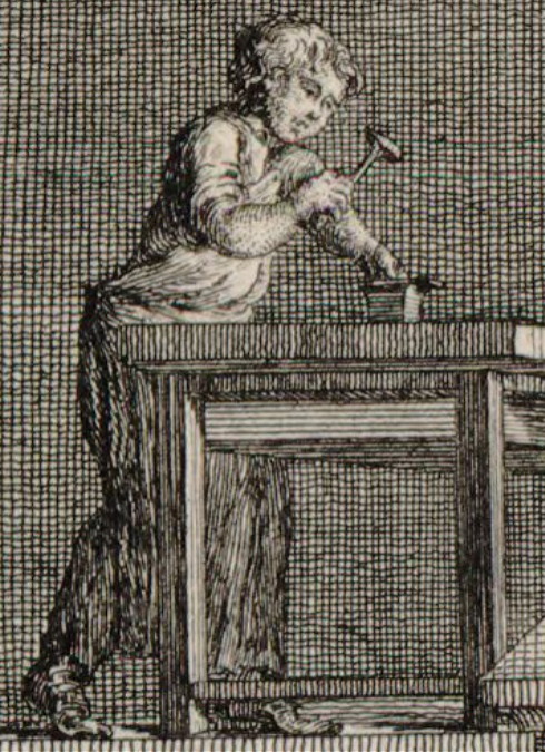И сново Claude-Louis Desrais ou Desray (1746-1816). Клод-Луи Дерэ или Дерэ - французский художник, гравер и дизайнер. Он сделал еще одну, более детальную гравюру. 1792 г. - 1794 г.!!! „Manufacture nationale. Fabrication Particuliere de bons rasoirs d'acier fondu parallèle a celle de Sheffield eu Angleterre”. „Отечественное производство. Особое производство хороших бритв из литой стали параллельно с производством в Шеффилде в Англии”. Надписи: „The Only manufacture in France of good razors of melted steel in the same manner as that of Sheffield in Yorkshire”. „Единственное во Франции производство хороших бритв из литой стали, аналогичных тех, которые производит Шеффилд в Йоркшире”. Le Petit Walle, aux Quinze-Vingts, Faubourg St. Antoane, a Paris”. „Le Petit Walle”, район „Quinze-Vingts”, предместье Сен-Антуан, Париж”. Взглянем поближе. Ручной привод шлифовальных машин: Ковка бритв: Мальчик пробивает отверстие для осевой заклепки: Мальчик собирает горячие бритвы, которые уронил после закалки: Шлифование: Заточка и контроль качества: Заклепывание: