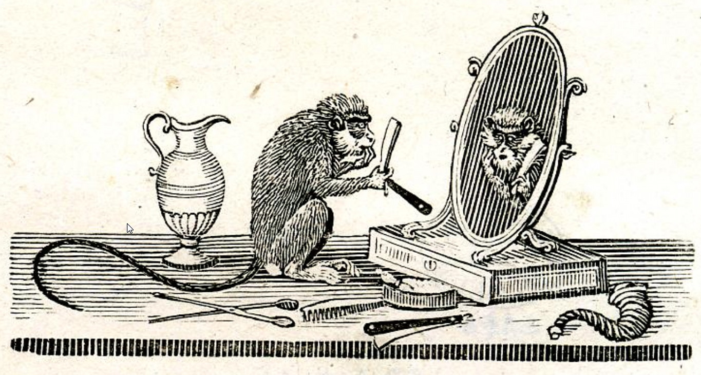 Иллюстрация из „Всеобщей истории четвероногих” Ральфа Бейлби (Ralph Beilby). „A monkey holding a cut-throat razor, biting its nails, looking into a mirror”, 1790 г. „Обезьяна, держащая бритвы, кусая ногти, смотрит в зеркало”. С 2013 г. с кайфом бреюсь опасной бритвой пять раз в неделю, в три прохода.