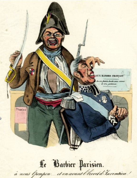 „The Allies shaving shop or Boney in the Suds”. „Цирюльня союзников или Бони (Наполеон Бонапрат) в пене”, 1813 г. (Политическая сатира. Фигуры пяти держав, Россия, Пруссия, Австрия, Швеция и Голландия владеют гигантской бритвой, в то время как Наполеон сидит в кресле среди мыльной пены). Надпись на второй бритве: „Prussian steel” (Прусская сталь): С 2013 г. с кайфом бреюсь опасной бритвой пять раз в неделю, в три прохода.