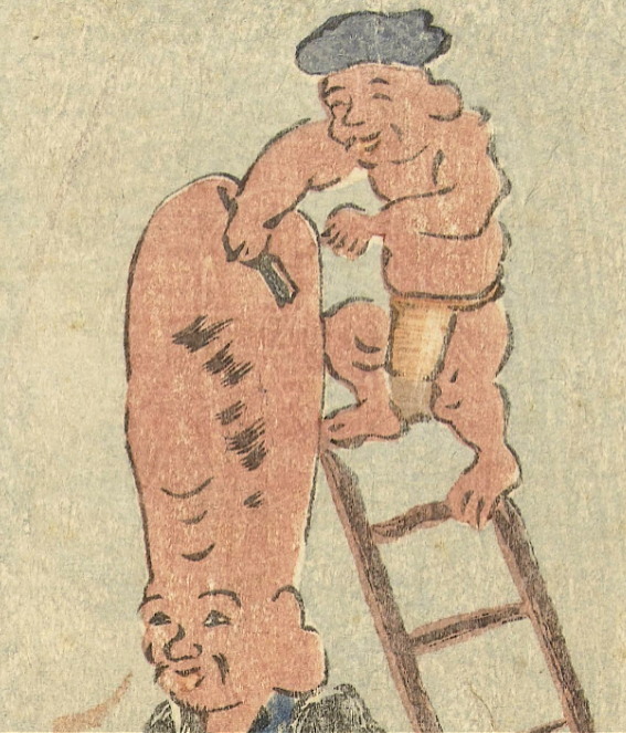 „Teahouse waitress reading a letter” „Официантка в чайном домике читает письмо” На заднем плане, при помощи лестницы, Дайкоку бреет голову Фукуроку: Подобную картину „Дайкоку и Фукуроку; Брить голову лестницей” 1857 г., я показал здесь: viewtopic.php?p=239752#p239752 Фукуроку (Фукурокудзю) - один из семи японских богов счастья. Был заимствован синтоизмом из китайского даосизма. В его имени синтезированы три цели. „Фуку” означает счастье, „року” - служебное благополучие, а „дзю” - долголетие и по возможности бессмертие. Фукурокудзю - небольшого роста с неестественно высоким лбом и лысой вытянутой головой, втрое большей, чем его тело. Дайкоку (Дайкокутэн) - один из семи японских богов счастья. Начиная с XIV века Дайкокутэн прочно утвердился в числе семи богов счастья, в роли кухонного бога снабжающего верующих едой. В этой роли он стал представляться как дородный торговец, с заплечным мешком, полным провизии. Среди купцов он стал почитаться как покровитель бизнеса. Также, иногда он почитается как покровитель фермеров и бог-охранитель дома. С 2013 г. с кайфом бреюсь опасной бритвой пять раз в неделю, в три прохода.