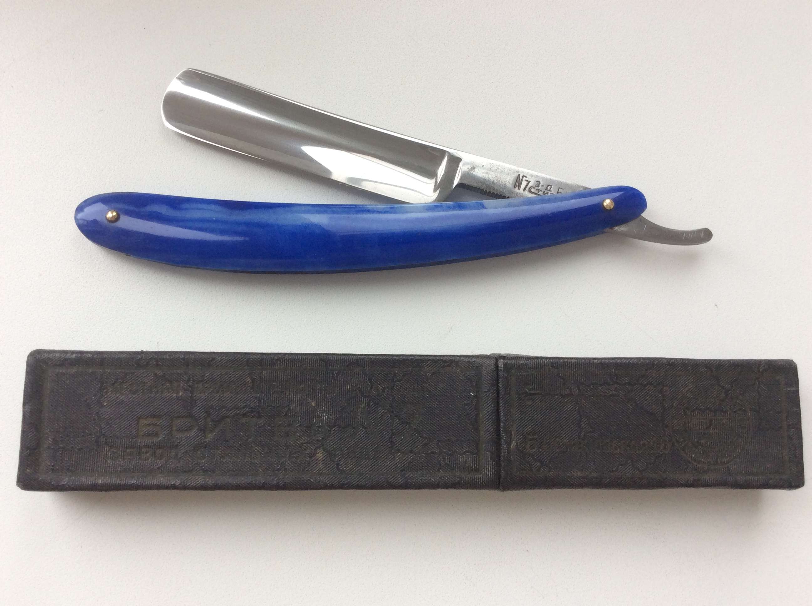 Продаётся от sergeyt3770ПРОДАНО. Советская бритва №7 от завода Стиз, 1951 года выпуска. Размер 11/16 (ширина 17 мм., толщина 4.2 мм.). В использовании не была. Не разбиралась, всё родное. Клинок закрывается по центру, не болтается. На клинке имеется патина в виде небольших потемнений. Вылизывать ничего не стал, т.к. на бритьё это не влияет, но доказывает, что с бритвой никаких манипуляций кроме заточки не производилось. На клинке заводской гринд и линия от электрохимической заточки. Сталь великолепного качества, в заточке показала себя превосходно. В комплекте родная коробочка в отличном состоянии. Бритва заточена и готова к работе.
