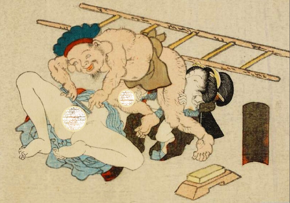 Специально для вас выложу замечательную картину - японская эротика с бритвой! Олег Бритва, я ее зацензурировал, но если так не годится, удалю без вопросов. Utagawa Kunisada (Toyokuni III) (1786-1864). Утагава Кунисада, известен также как Утагава Тоёкуни III - крупнейший японский художник и мастер цветной графики периода Эдо. Эксперты считают, что он или художник его школы является автором этой картины. „Daikoku shaving а woman” „Дайкоку бреет женщину” Взглянем поближе: