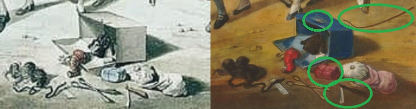 Но при ближайшем рассмотрении хорошо видны разницы. На гравюре бритва покрупнее, лица разные, предметы на стене тоже отличаются: