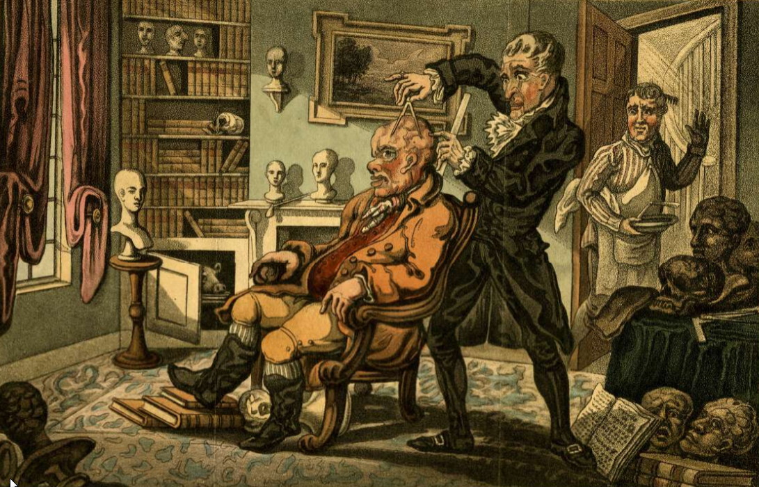 „A craniological examination” „Краниологическое обследование” Справа цирюльник: (Краниоло́гия - комплекс научных дисциплин, изучающих нормальные вариации формы черепа у человека и животных. В учении об антропогенезе данные краниологии используют при характеристике этапов физической эволюции человека и обезьян). С 2013 г. с кайфом бреюсь опасной бритвой пять раз в неделю, в три прохода.