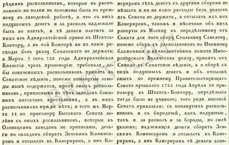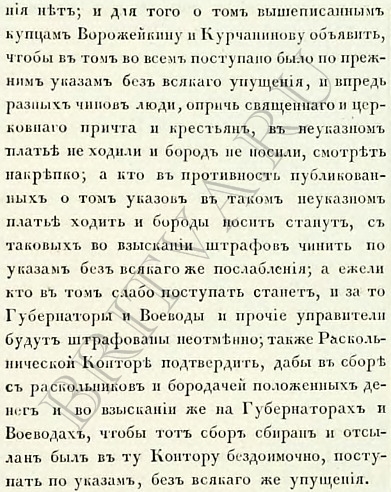 Императрица Анна Ивановна Фото №17: Анна Ивановна, 1735 г. Указ № 6780. - Iюля 29. - О присылкѣ вѣдомостей въ Раскольническую Контору о раскольникахъ и бородачахъ, въ началѣ каждаго года; о сборѣ съ нихъ денегъ и недоимокъ и объ отдачѣ изъ оной Конторы ежемѣсячно поступающихъ въ приходъ денегъ въ Московскую Рентерею для употребленiя въ расходъ, по предписанiю Штатсъ-Конторы. Императрица Елизавета Петровна Фото №18: Елизавета Петровна, 1743 г. Указ № 8707. - Февраля 19. - О ношеніи Нѣмецкаго платья, о бритіи бородъ и усовъ, о хожденіи раскольникамъ въ указномъ для нихъ одѣяніи. Фото №19: продолжение указа № 8707 Фото №20: продолжение указа № 8707 Фото №21: Елизавета Петровна,1748 г. Указ № 9479. - Февраля 11. - О подтвержденіи, чтобы никто, кромѣ священнаго и церковнаго причта и крестьянъ, не ходилъ въ неуказномъ платьѣ и не носилъ бороды. Фото №22: продолжение указа №9479 Фото №23: продолжение указа №9479