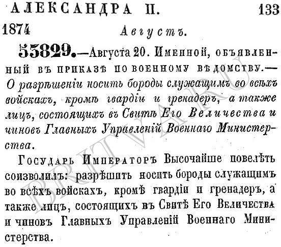 Фото №51: Александр II, 1874 г. Указ № 53842. - Августа 29. - Объ изъятіи Корпуса Жандармовъ отъ разрѣшенія носить бороды. Фото №52: Александр II, 1875 г. Указ № 54988. - Августа 11. – О недозволеніи фабрить усы и бороду въ тѣх войскахъ, въ которыхъ разрѣшено носить бороду. (Фабрить означает красить особой косметической краской, так называемой фаброй, усы, бороду). Следует повторный указ „не фабрить” (не красить). Фото №53: Александр II, 1875 г. Указ № 55116а. - Октября 4. - О томъ, чтобы въ командахъ, въ которыхъ разрѣшено носить бороду, ни бороды, ни усовъ не фабрить. Не надо думать, что кто-то красил усы из-за суетности. До этих двух указов они чернили усы, выполняя кавалерийского устава, принятым во времена правления Елизаветы Петровны. Фото №54: В кавалерийском уставе (Экзерциции) 1755 года, часть 1, глава 10, статья 136, пункт второй, написано: "Каждому кирасиру и драгуну надлежитъ, какъ возможно стараться усы отращивать, которыебъ всегда въ строяхъ и караулахъ вверхъ подчесаны, и подчернены были, а у гранодеръ конныхъ можно усы, какъ возможно длинно выростя, по щекамъ заворачивать; у кого же по молодымъ лѣтамъ натуральныхъ усовъ еще нѣтъ, или по природѣ пустобородъ, то употреблять такимъ образцомъ накладные". Как видите, если натуральных не было, применяли накладные усы. Император Александр III Александрович Фото №55: Александр III, 1892 г. Указ № 8970. - Октября 22. - О предоставленіи нижнимъ чинамъ отдѣльнаго корпуса жандармовъ носить бороды, наравнѣ съ прочими нижними чинами армейскихъ частей. Император Николай II Александрович Историки считают, что последний императорский указ на тему бород был издан уже в начале XX века, в 1901 году: император Николай II своей высочайшей волей разрешил ношение бород, усов и бакенбардов даже юнкерам. Фото №56: Николай II, 1901 г. Указ № 19704. - Февраля 20. - О ношеніи усов и бороды воспитанниками военно-учебныхъ заведеній. В конце статьи еще раз объясню, что пометил фотографии водяным знаком ради одной единственной цели - чтобы, когда в результате поиска люди их увидят, потом они зайдут на сайт и будут читать про опасных бритв. Кроме того, и ежу понятно, что зная номер и год указа, его очень легко можно найти в оригинале. Статья состоит из множество частей, потому что в одном посту можно выкладыват ограниченное количество фотографии и в то же время, когда указ состоит из несколько фотографии, они должни находится вместе. В течение полгода я просмотрел более 40 тыс. страниц, и думаю, что наверное не успел найти всех указов и я убежден, что есть еще, по крайней мере, несколько штук. К сожалению, некоторые вещи все еще остаются „белыми пятнами” из-за неполноты имеющихся архивных источников. Но я надеюсь, что рано или поздно эти пробелы заполняться. На всякий случай у меня такая просьба. Если кто-то найдет информацию о неизвестном указе росийских императоров или императриц, связанным с бритьем, пусть сначало посмотрит на него своими глазами, убедиться в его существования и что он относиться к теме, а потом пусть напишет его номер и год или покажет фото. Потом я его поставлю среди других указов в хронологическом порядке. Я выложил 31 указов, статья Свода военных постановлений и статья Кавалерийского устава (Экзерциции). Может быть, кому-то всё это покажется скучным, но для меня эти документы являются бесценными кусочками российской истории! И я надеюсь, вам интересно о