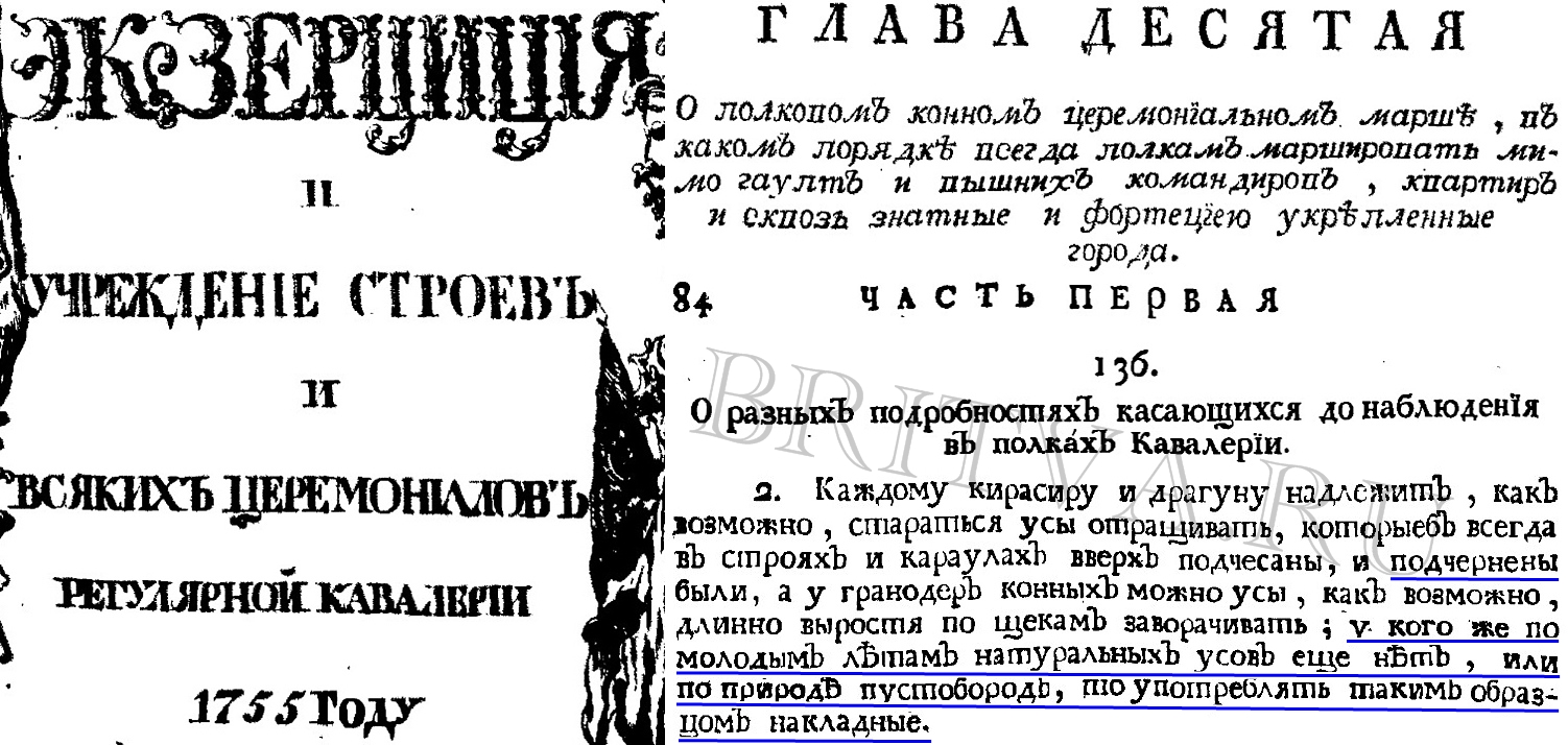 Император Александр I Фото №37: Александр I, 1820 г. Указ № 28374. - Августа 7. – О дозволеніи Генераламъ, числящимся въ Драгунскихъ Дивизіяхъ и по Конной Артиллеріи, и Драгунскимъ и Конно-Артиллерійскимъ Штабъ и Оберъ-Офицерамъ носить усы. Император Николай I Павлович Фото №38: Николай I, 1832 г. Указ № 5422. - Iюня 8. - О дозволеніи всѣмъ Генераламъ, Штабъ- и Оберъ-Офицерамъ носить усы. Фото №39: Николай I, 1837 г. Указ № 10076. - Марта 30. - О неношеніи лицамъ, имѣющимъ придворныя званія, усовъ и бородъ. Фото №40: Николай I, 1837 г. Указ № 10092. - Апрѣля 2. - О воспрещеніи гражданскимъ чиновникамъ носить усы и бороду. Император Александр II Николаевич Фото №41: Александр II, 1855 г. Указ № 29129. - Марта 14. - О томъ, въ какiе дни и въ какихъ случаяхъ войскамъ фабрить усы и бакенбарды, быть въ султанахъ и носить чешуи загнутыми. (Фабрить означает красить особой косметической краской, так называемой фаброй, усы, бороду). В воскресные дни вступать имъ в караулъ съ нафабренными усами и бакенбардами. Фото №42: Рисунок с обозначениями, что такое „чешуя” (подбородный ремень с чешуей) и что такое „султан”: Фото №43: Александр II, 1855 г. Указ № 29859а. - Ноября 25. – О ношенiи усовъ всѣмъ гражданскимъ чинамъ морскаго вѣдомства.