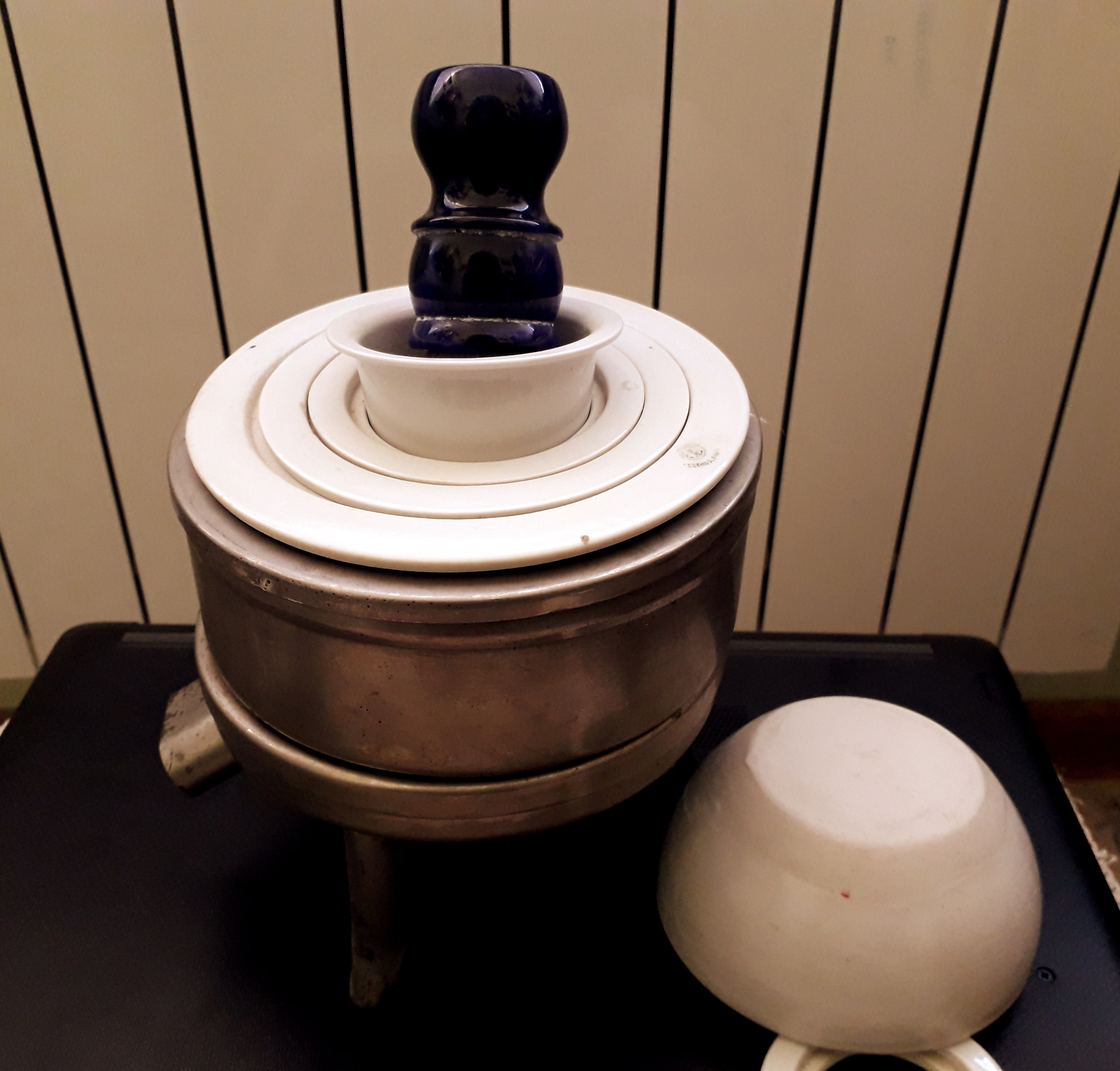 Выбор кружкиВодится у меня такой прибор на электрической тяге. Воды в кастрюлю и в розетку на минуты три. Можно использовать в двух вариантах: для взбивания мыла в чашке и на лице.