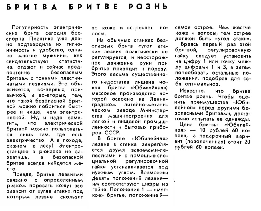 Вот вам ссылка: http://wiki.badgerandblade.com/US_Gille ... nformation" onclick="window.open(this.href);return false; А по первой вашей ссылке это весьма редкий и дорого продающийся на ибэе товарищ, имя которому *Toggle*. А по второй вашей ссылке товарищ тоже известный, только имя ему не Слим, а ФэтБой. Разница четко просматривается в толщине диаметра ручки и высоте регулировочного кольца. Re: Юбилейная бритва в позолоте.Извинюсь за оффтоп, но ещё один друг из 60х, копия штатовской вещи и родом из Ленинграда, судя по картинке.