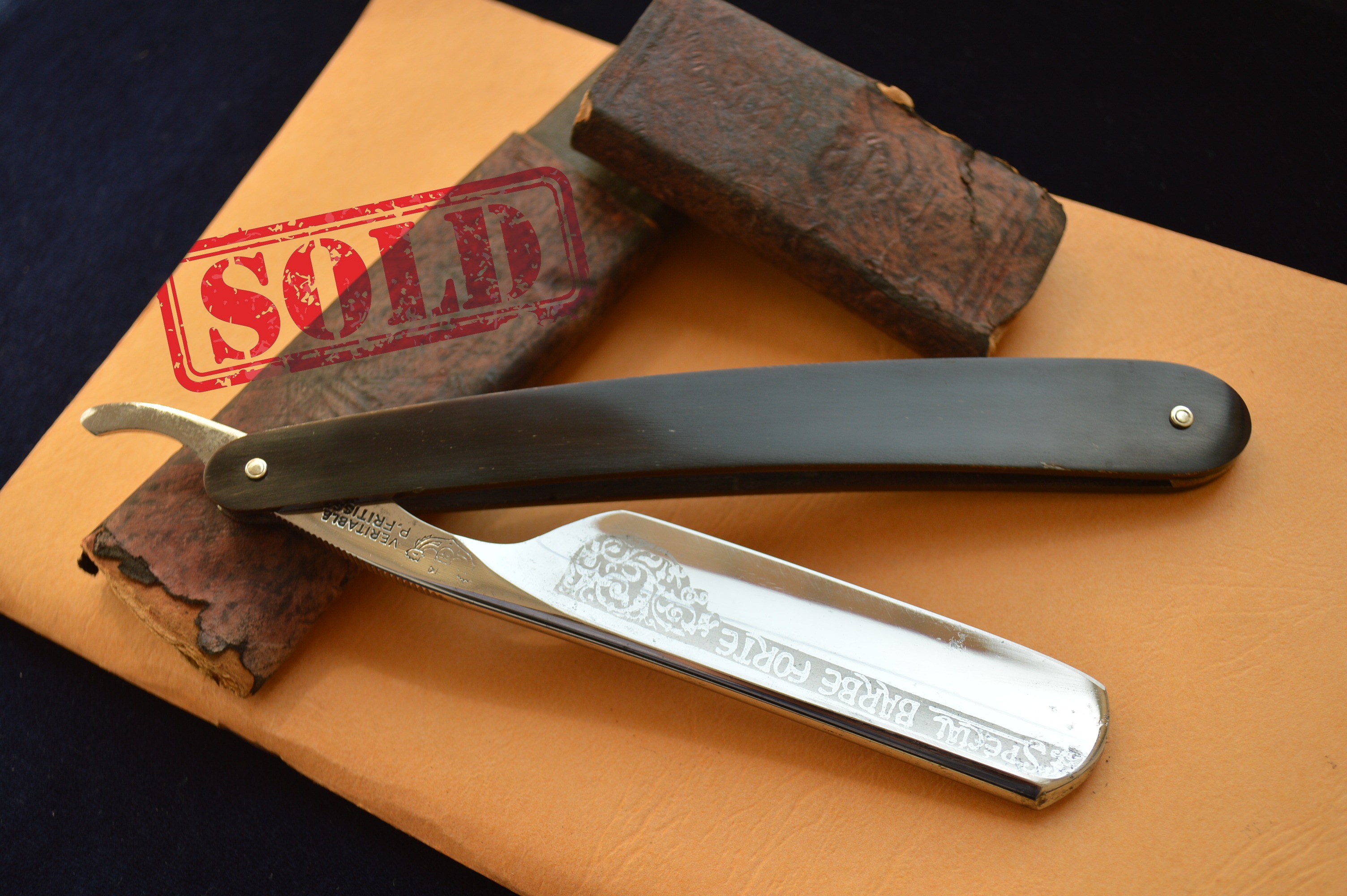 Профессионально восстановленная бритва в строении клин. Ширина полотна – 6/8, ручка рог в замечательном сохране. Сама сталь в лучших традициях французских бритв: вязкая, мелко-зернистая, бритье превосходно мягкое и чистое. То, как бреет эта бритва можно рассказывать часами, но главное, что вам нужно знать это то, что мягче бритвы вы не пробовали это точно. Отдельного упоминания заслуживает форма бритвы и исполнение спинки, эрля и хвостика. Насечки на эрле с двух сторон, которые позволяют очень удобно удерживать бритву, верхняя насечка просто громадная, редчайший вариант исполнения, при этом сам эрль удобен тем, что идет от нижней насечки к верхней на утолщение...очень тонкий ход от производителя, добавляет удобства в удержании, очень удобно в бритье при проходе сверху-вниз, а так же отдельного внимания заслуживает форма полотна, которое имеет сильно выраженную улыбку, что лучшим образом скажется на бритье. Спинка имеет ровную площадку, если бритву поставить на спинку, то она на ней так и будет стоять, от спинки уходят спуски к полотну, образовывая в сечении трапецию. Пользуйтесь возможностью, такие достойные и незаурядные образцы старой Франции практически не встречаются. За деталями прошу обращаться в личные сообщение. Оплата по договоренности обсуждается в л/с (зачастую это перевод на карту Виза по курсу на день покупки), отправка посредством государственной почты Украины и России. Резерв в л/с. Цена 600 дол (доставка включена в стоимость) Spoiler Show