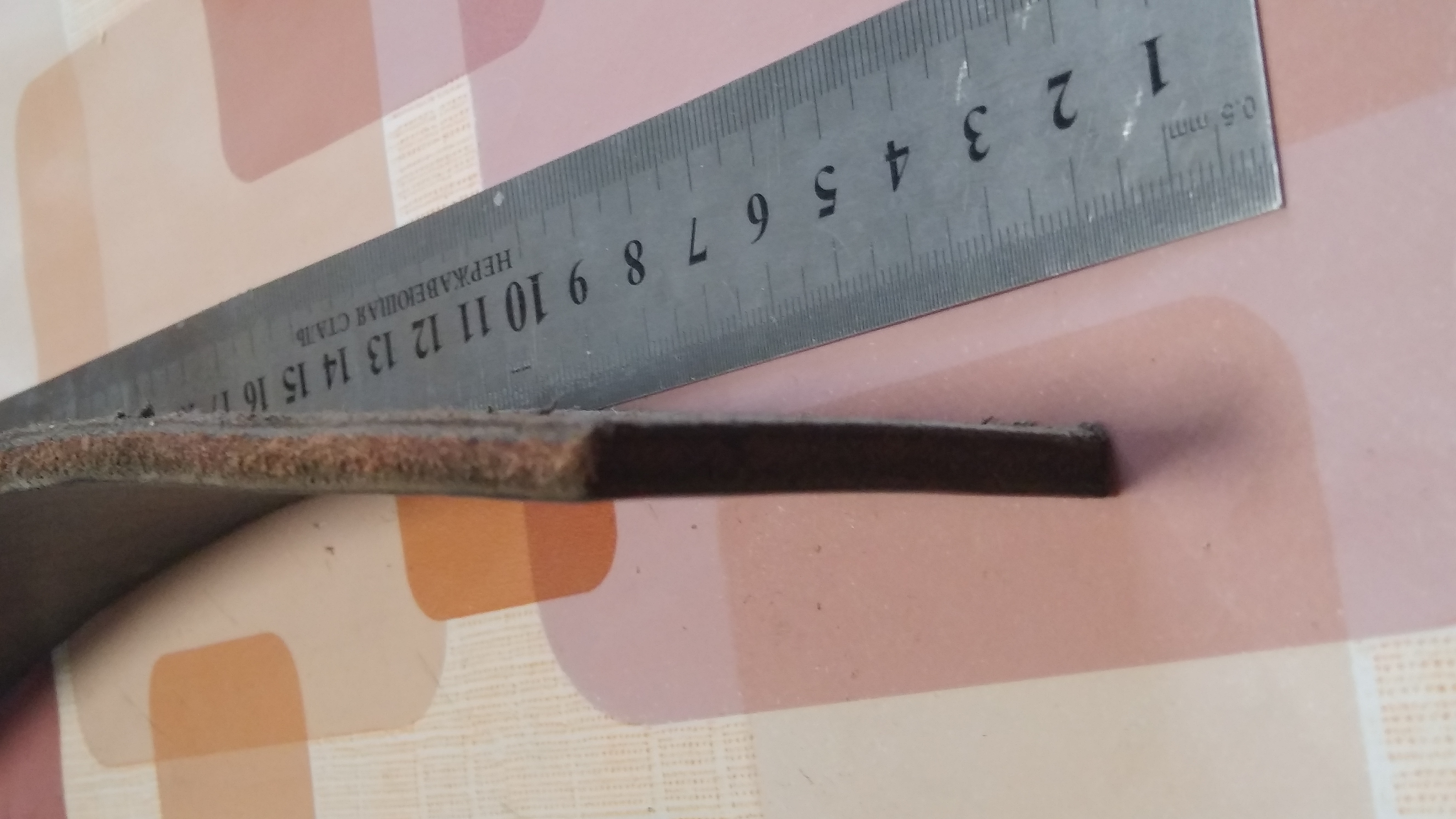 В поисках кожи для ремня набрёл на рынке вот на такое чудо: Кожа, если верить продавцу, ещё советской выделки, Васильковского завода. Что за дубление - неизвестно. Изначально полоса была 120 см, отрезали половину. Ширина ровно 5 см, толщина 6,5 мм(!). Ремень толстый, тяжелый, я бы даже сказал - монументальный)), при этом абсолютно не "дубовый" и весьма эластичный. Лицевая сторона довольно таки ровная, думаю, шкурить придётся недолго. Заодно прикупил фурнитуры. Заклёпочника у меня нет, да и винты мне больше нравятся как таковые. Для подвеса выбрал нержавеющий треугольник: Сгибать 6,5 мм, разумеется, нереально, буду делать накладки. Для которых прикупил пару кусков кожи 2,5 мм толщиной. Заодно из этой кожи думаю сделать досточку под пасту. Фоткал телефоном, сильно не пинайте.
