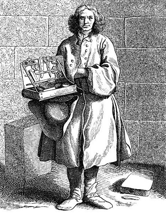„Man selling objects for hair care and shaving” „Мужчина продает предметы для ухода за волосами и бритья”, 18 век. В коробке пара бритв: С 2013 г. с кайфом бреюсь опасной бритвой пять раз в неделю, в три прохода.