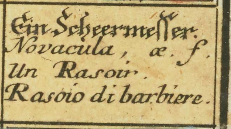 Вот, пожалуйста, иллюстрации из его книги „Kleines Bilder-Cabinet zu Erlernung der vier Sprachen. I. Teutsch, II. Lateinisch, III. Französisch und IV. Italianisch”, Augsburg, 1735. „Небольшой шкаф с картинками (словарь) для изучения четырех языков. I. Немецкий, II. Латинский, III. Французский и IV. Итальянский”, город Аугсбург, 1735 г. На одной из страниц: Бритва: Бритва на латинском языке - Novacula, и как мы знаем, от него произошло сборное название камней для заточки бритв - Новакулиты. На другой из страниц: Цирюльник: Цирюльник на латинском языке - Tonsor, что мы уже знаем.