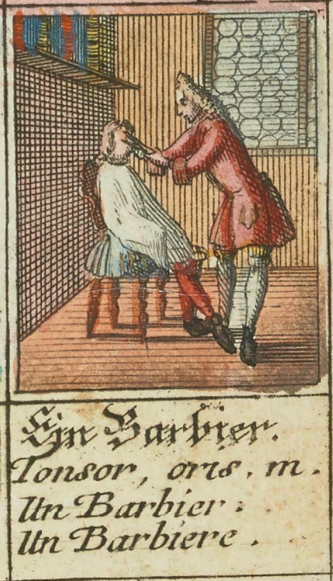 Вот, пожалуйста, иллюстрации из его книги „Kleines Bilder-Cabinet zu Erlernung der vier Sprachen. I. Teutsch, II. Lateinisch, III. Französisch und IV. Italianisch”, Augsburg, 1735. „Небольшой шкаф с картинками (словарь) для изучения четырех языков. I. Немецкий, II. Латинский, III. Французский и IV. Итальянский”, город Аугсбург, 1735 г. На одной из страниц: Бритва: Бритва на латинском языке - Novacula, и как мы знаем, от него произошло сборное название камней для заточки бритв - Новакулиты. На другой из страниц: Цирюльник: Цирюльник на латинском языке - Tonsor, что мы уже знаем.