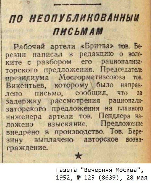 1952 год, не понравилось рабочему Березену, что его рацпредложение не внедряют. После сигнала в газету всё ускорилось, внедрили и даже выплатили соответствующее вознаграждение.