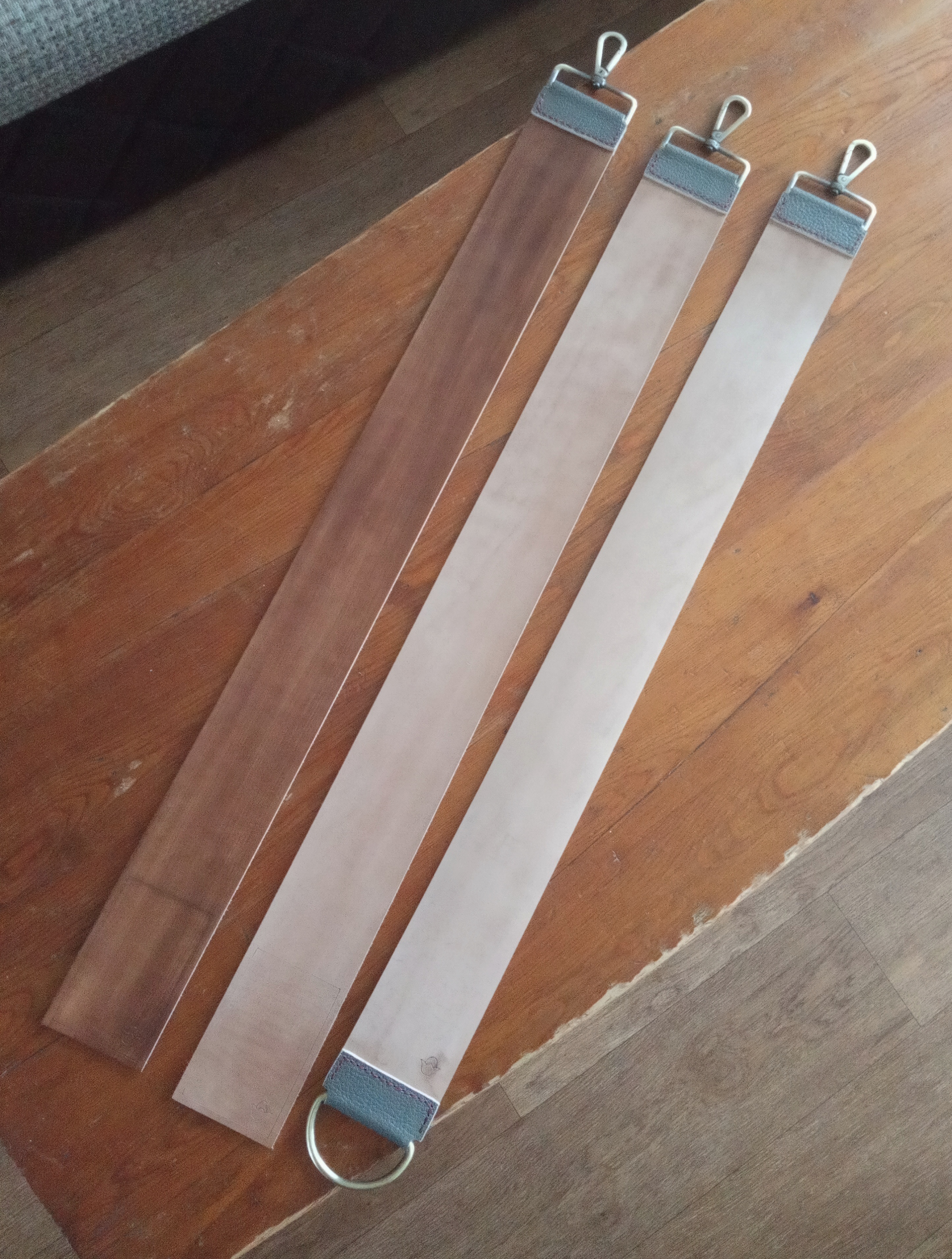 Кожа КРС смешанного дубления 2,3мм. Вышкурено, шлифовано. Поверхность бархатистая. Обработано копытным маслом. Со свободным барберским хватом (лично больше предпочитаю) 630х60мм - продано. С полукольцом 600х60мм - продано Экземпляры с визуальными дефектами немного дешевле. Ватсапп: 8-906-950-35-58