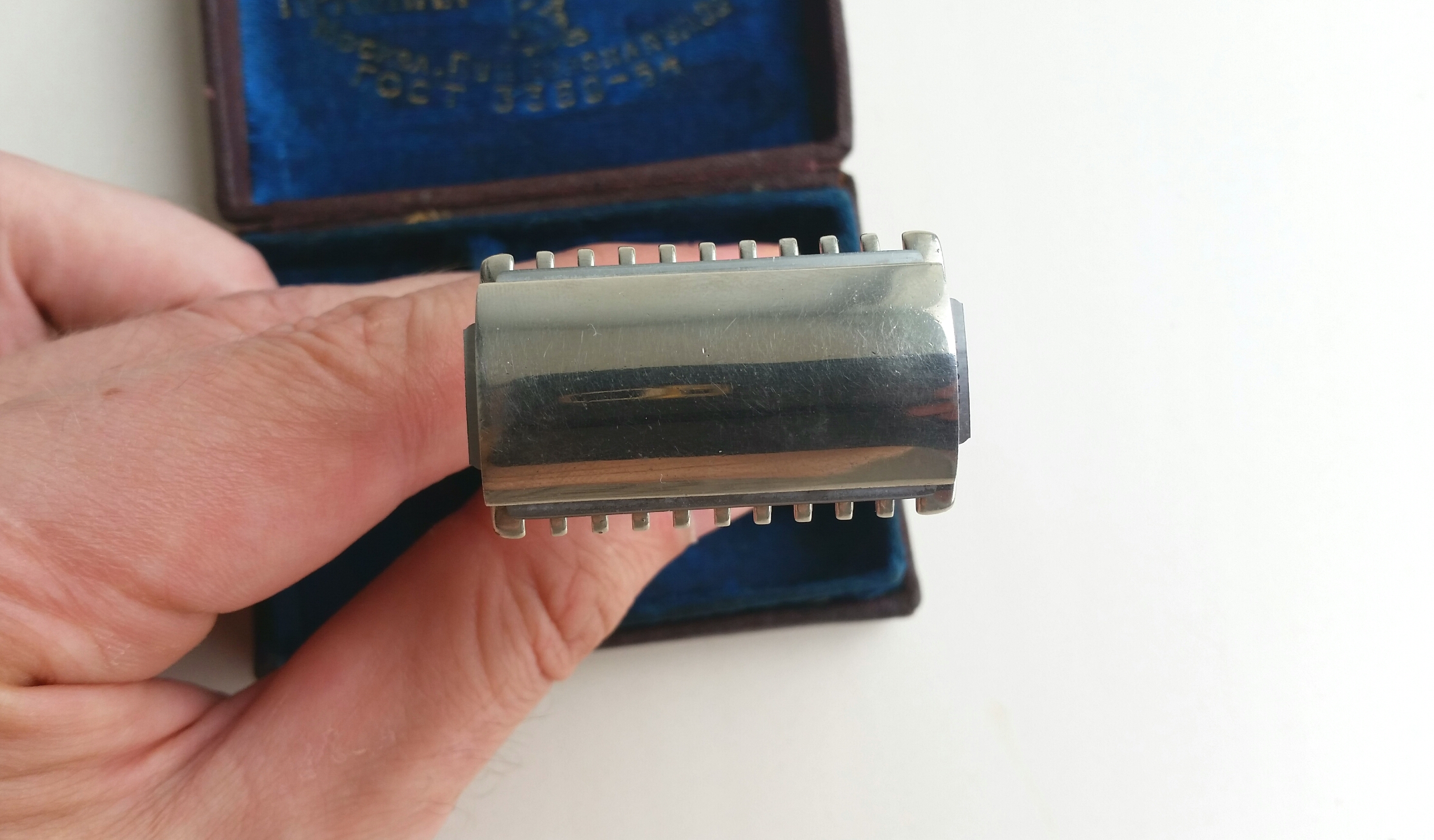 Открываем, тут внутри обито синим сукном, на верхней части желтой краской указан завод, логотип, ГОСТ. Внутри есть отсек под лезвия слева, а справа второй отсек разделен на ячейки под ручку и под голову. Все лежит на своих местах, но если положить в багаж, то будет подскакивать, надо положить что то, прямоугольник ткани, например, как прослойку На крышке снизу есть клеймо КЗ, года нет, думаю, что изготовлено где то во второй половине 50х. Открытая гребенка, потерь у покрытия нет, есть следы от ручки. Ручка двухсоставная, с приятной и цепкой насечкой. После получения, обработал весь станок и футляр изнутри Стериллиумом Длина станка в собранном виде 75 мм, вес 56 гр Вот так лежит в моей руке, ощущается очень миниатюрным Для примера, фото рядом со стандартной Мюле 41, разница велика Вылет лезвия. Он не идеально равномерный, где то больше, где то меньше, лезвие Астра зеленая, уши торчат значительно. Сначала подумал, что каждая сторона будет брить по своему... Итак, лезвие заряжено, все готово. Начал с той стороны, где вылет чуть меньше - хорошо идет по росту, мягко, никаких потягиваний и эффективно. Перевернул станок - странно, но тоже самое, разницы нет. До этого открытыми гребенками не брился. Снимает щетину очень хорошо, при этом деликатно, лезвие чувствуется, но не как острое, а как натянутая струнка, так же иногда ощущал зубья гребенки, но они не острые, просто есть, не доставляет проблем. Станок короткий, не совсем удобно было его полоскать от пены, вот прямо на грани. Верхняя часть ручки по толщине меньше, хотелось бы тут потолще, но в целом, ручка негатива не вызвала, ценкая и привыкнуть можно быстро. По росту очень хорошо снял и мягко. Пошел против, брило тоже неплохо, но той мягкости уже не было, не скажу, что жестко, но и не мягко, что то среднее. Зато эффективно, срезает с первого раза начисто. Поставил 1 точку на шее, в остальном все отлично. Часто ориентируюсь на бритье усов против, если есть проблемы, то в этой области они всплывут - при не эффективной бритве, приходиися тут елозить и часто щетину потягивает, бывают точки. А тут удивило - не тянуло ничего вообще и с 1 раза сняло чисто, никаких точек. Выбрился очень чисто, без шкрябаний по одному месту, тут этого не требуется, станок эффективный. Взял Клабмен Коньяк, щедро нанес, щипало да, на щеках и усах прямо чуть и мимолетно, на шее несколько сильнее. На шее внизу образовалось легкое покраснение после Клабмена, прошло через минуту, глянул в зеркало - все идеально. Астра себя тут хорошо показала, острая и эффективная, надо что то еще попробовать. Если сравнить с Кингом, то по росту КЗ бреет не так резко, идет мягче и снимает чуток больше, но против роста Кинг кажется помягче, но не такой эффективный, в зоне усов КЗ однозначно рулит. Когда собрал станок, вылет и гребенка казались довольно устрашающими, а по факту же совсем не так, я даже попробовал пару раз махнуть и станок чувствовался безопасным и комфортным. Думаю, что КЗ будет более вариативна в плане разных лезвий и будет выдавать разные результаты, в отличие от Кинга, который тут был довольно стабилен. Время покажет, но пока станок порадовал, визуально приятный, да и советский винтаж я люблю))) Станки производства СССР и постсоветского пространства.это