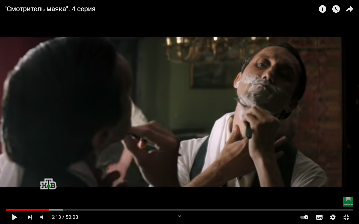 Актер (играющий штабс-капитана отечественных спецслужб начала века) довольно талантливо имитирует процесс: наносит немного жидковатую пену, затем бреется - по росту волоса, и по горлу против роста, причем оттягивая кожу. Канонічески даже мастерски обтирает в конце об х/б ткань бритву, держа её жалом вверх и проводя по всей длине лезвия от пятки, как это рекомендуется в инструкциях.