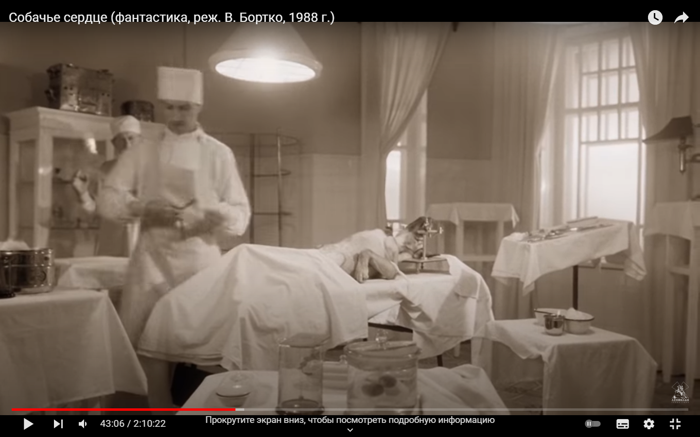 Доктор Борменталь проводит обработку операционного поля Шарику, перед пересадкой ему гипофиза и семенных желез Клима Чугункина - намыливает помазком, затем опасной бритвой сбривает шерсть.