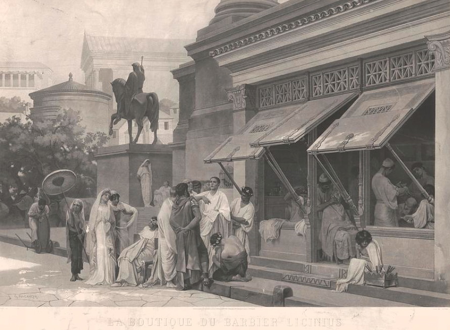 „La boutique du barbier Licinius” „Цирюльня Лициниуса” В центре наблюдаем бритье, а справа - правка бритвы на ладони: С 2013 г. с кайфом бреюсь опасной бритвой пять раз в неделю, в три прохода.