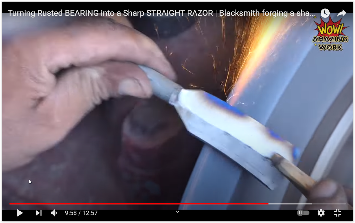 Цвета побежалости! Неужели это и есть тот знаменитый „быстрый пакистанский” низкий отпуск стали? Правка на полусогнутом куском резины, очень инновативно! Это видео в очередной раз показывает, что можно бриться любым острым инструментом (хоть топором, саперской лопаткой и др.). А вот, для удобного, комфортного и чистого бритья нужна качественная и хорошо заточенная острая бритва! С 2013 г. с кайфом бреюсь опасной бритвой пять раз в неделю, в три прохода.