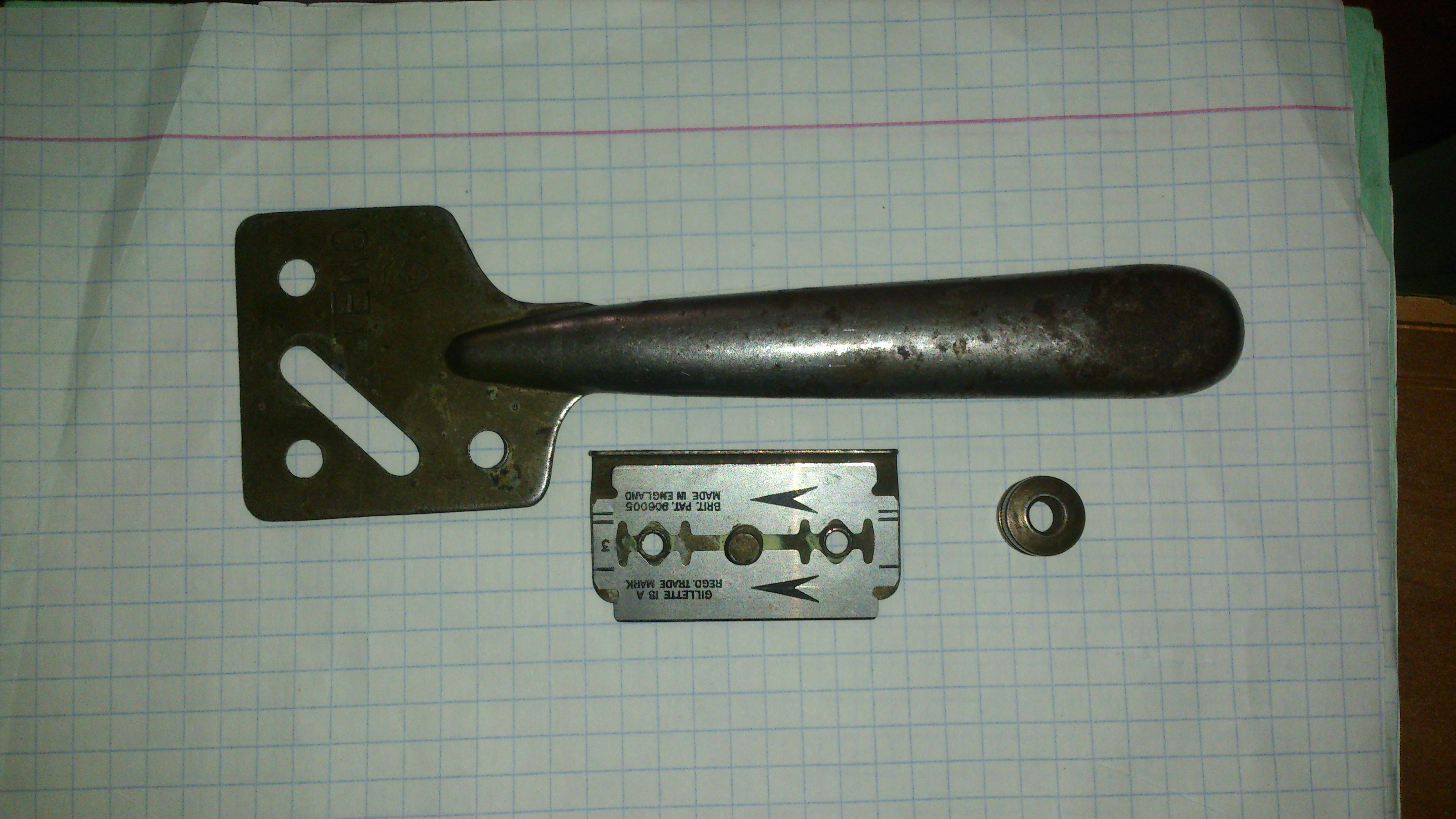 что ты такое?Доброго дня всем! Не пинайте,но не могу узнать ,что за чудо?Пробовал искать и по картинке и по логотипу,но не вышло,либо не так искал... Похожа и на бритву (псевдоопаску)и на скребок для керамических плит(на кухне похожая есть современная пластиковая) и ,как предположил один человек,видел подобную вещь 50 лет назад у аквариумиста для соскребания водорослей,но был в наборе для бритвенных принадлежностях ,по надписи на ящике 1918г.