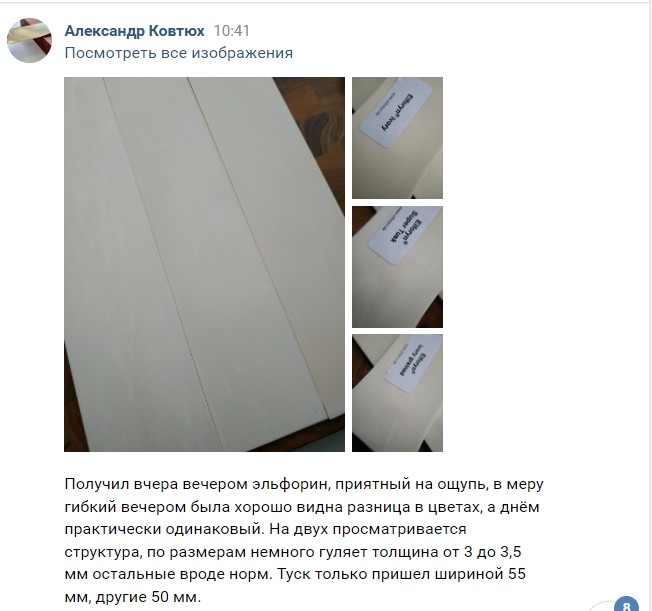 На первый взгляд элфорин очень однотонный, цельный, а вот и микроструктуру, якобы, можно проявить некоторыми способами, причём похожую под рисунок микроструктуры бивня слона. Я пытался проявить её, но не прям сильно заморачивался, потому и не увидел, или не проявил, возможно, но кто то этого добивается. PS Кстати, сейчас глянул, в инет по теме «элфорин» и увидел, что появился некий «элфорин экстра». Может врут. Например тут -http://www.artwood.ru/catalog/view/6030.html PPS Нет не врут - вот он на сайте производителя (супер элфорин нью - «супер бивень») - https://www.elforyn.de/en/products/bill ... labs?c=307 PPPS А может микроструктура под слона сделана/больше проявлена в этом новом элфорине, который "супер бивень", а у меня то старый который, потому и не вижу...? Не зря же он представлен как новый продукт «супер бивень» (Super Tusk), чем то он должен отличаться от обычного жж, некие новые свойства должны же быть... Но в любом случае цены у производителя одинаковы на новый и старый элфорин, и значительно упали сейчас! Набор из 52 накладок на клавиши фортепиано размером 2.2х25х160мм продают за 185 эбро (если покупать одну, то =3,59), но +почта, а слэб (полоса) 3х50х305мм за 22.91эбро. (налетай не скупись, покупай...ь). А ещё элфорин имеет "возможность термического формования в кипящей воде" (possibility of thermal moulding in boiling water) ...