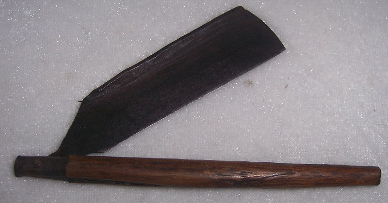 Вывод о том, что данная бритва является подделкой, скорее всего связан с ее ценой. Должна быть недорогой. У меня есть примерно такая же бритва и я провел небольшое исследование. Скорее всего эта бритва имеет японское происхождение. Она изображена на многих японских миниатюрах XVII-XIX веков, посвященных жизни и быту самураев. Бритье самурая как раз и осуществлялось брадобреем при помощи подобной бритвы. Косвенно японское происхождение этих бритв подтверждается тем, что в Китае в последние столетия постоянно проходили глобальные события, которые от людей-то ничего не оставляли, а не то что от бритв. В Японии наоборот - глубочайшее уважение к предкам и всему, что с ними связано. Бережливость, граничащая с фанатизмом. Что касается ценообразования и откровенной дешевизны, то с бритвами подобная ситуация присутствует повсеместно. Частенько 150-летние бритвы продаются за 20 баксов. Почти двухсотлетнюю бритву (1830-1837 гг.) купил как-то за сороковку. Вот тоже самое и в Японии, много старинных бритв сохранилось. По японским реалиям консультировался с востоковедом-японистом.