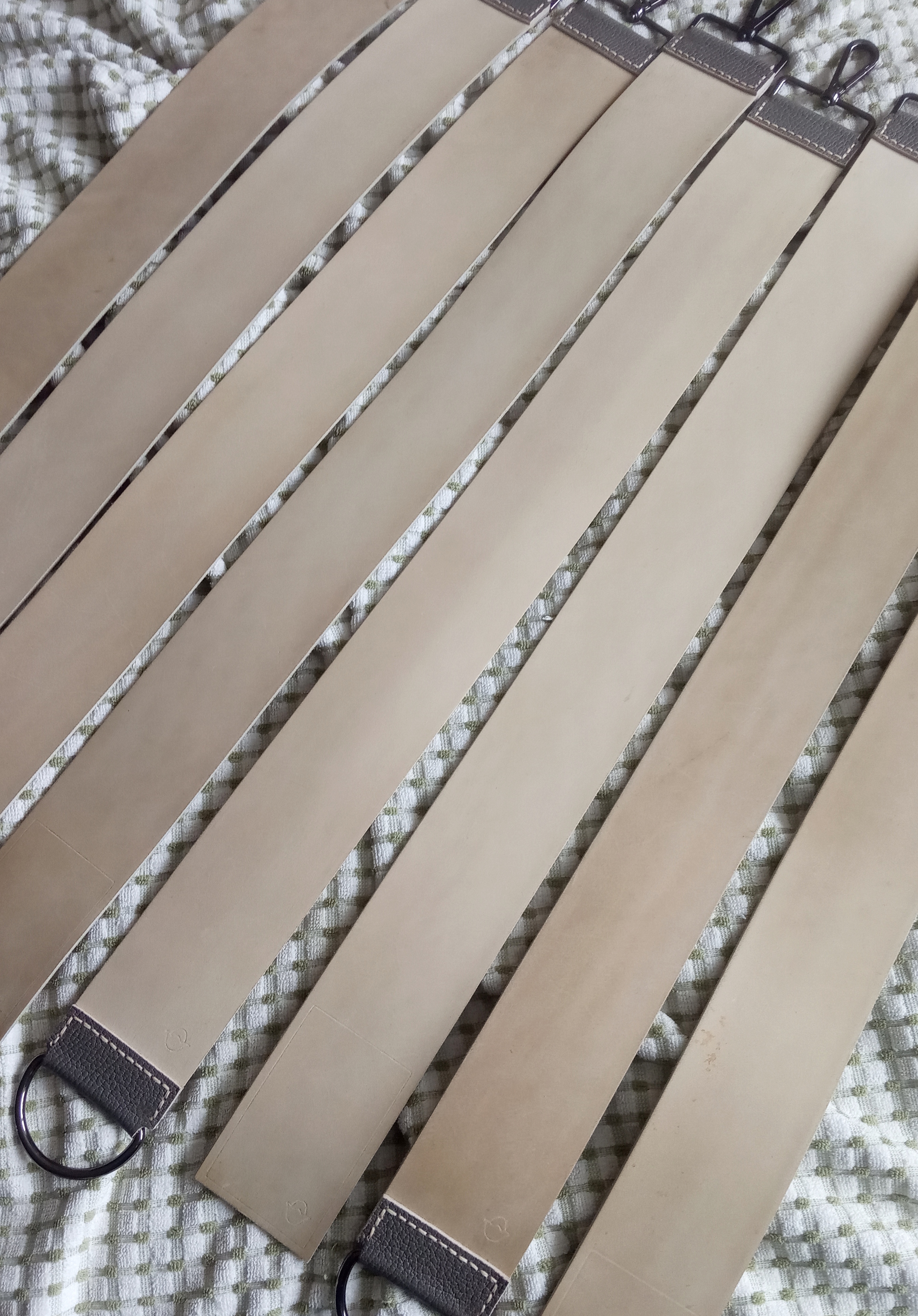 Кожа КРС смешанного дубления 2,3мм. Вышкурено, шлифовано. Поверхность бархатистая. Обработано копытным маслом. Со свободным барберским хватом (лично больше предпочитаю) 630х60мм - продано. С полукольцом 600х60мм - продано Экземпляры с визуальными дефектами немного дешевле. Ватсапп: 8-906-950-35-58