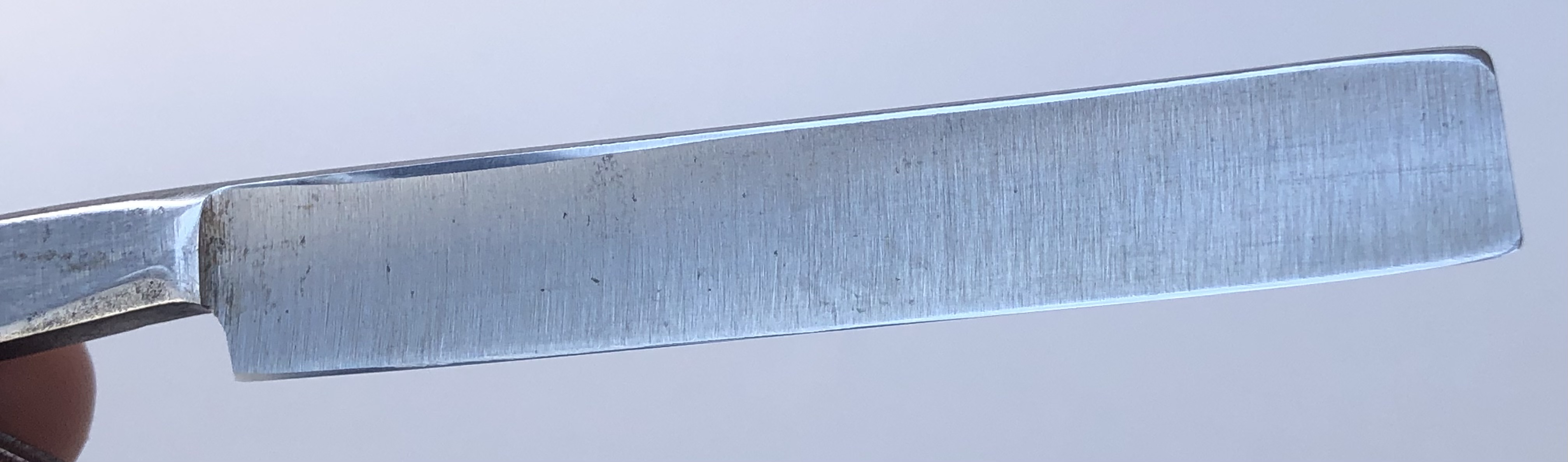 Само полотно на несколько мм укорочено.Было немного освежено от патины, с повторением "родного" характера шлифовки и умеренной полировки.Идеальная геометрия клинка. Сталь чистая, без видимых дефектов.Очень приятная во всех отношениях бритва, достаточно недорогая и если бы не укороченное полотно, то цены бы ей не было...