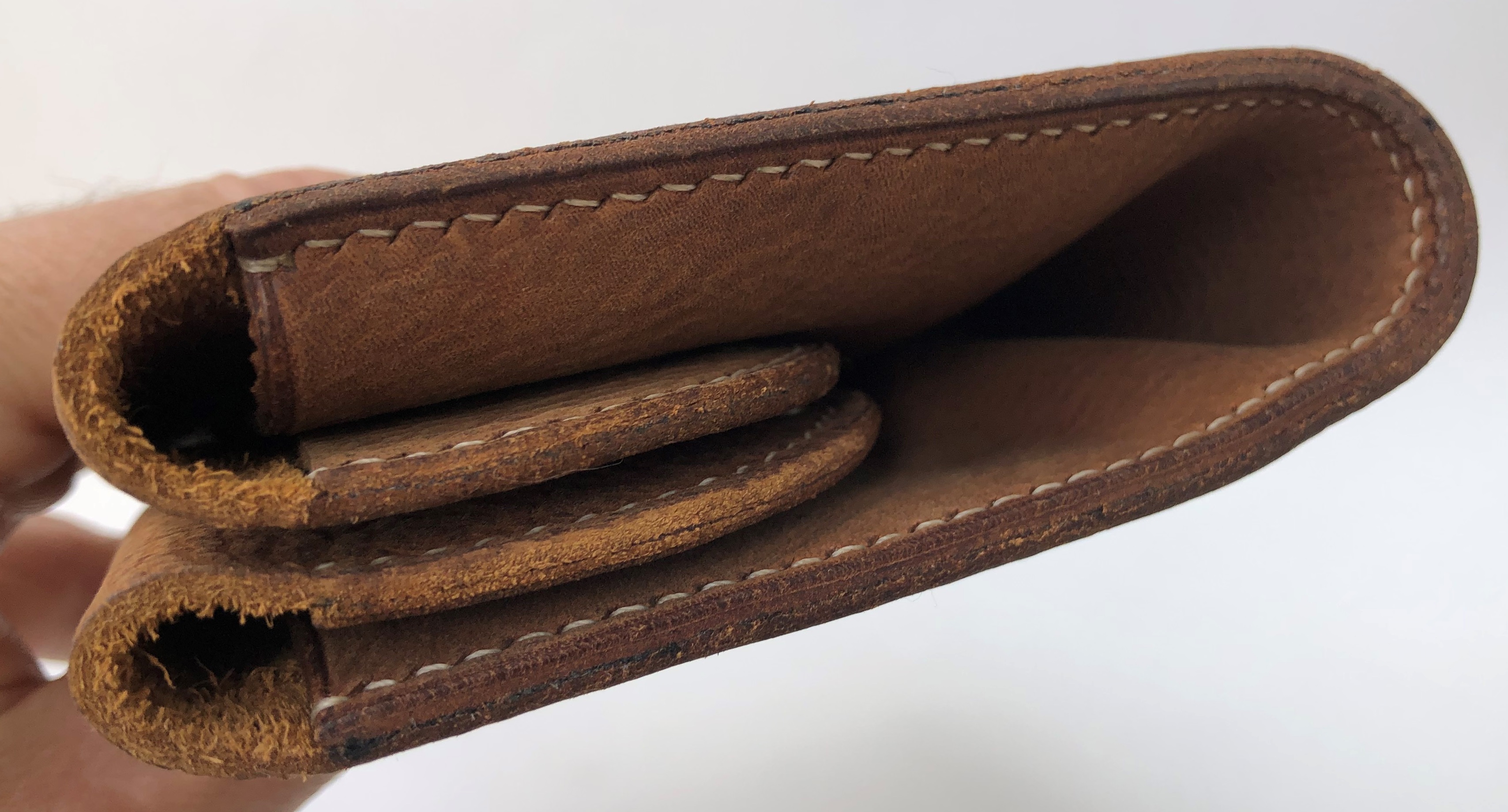 По всей видимости была изготовлена 7-8 лет назад. Идеальное состояние новой вещи. Двухсторонний. На одной стороне полотно кожи было поменяно (Александр,Винтаж студио).Кожа на обеих сторонах чистая, отполирована и пропитана костным маслом. Очень хорошо подойдет в качестве недорогого варианта для новичка, а также для походных условий.