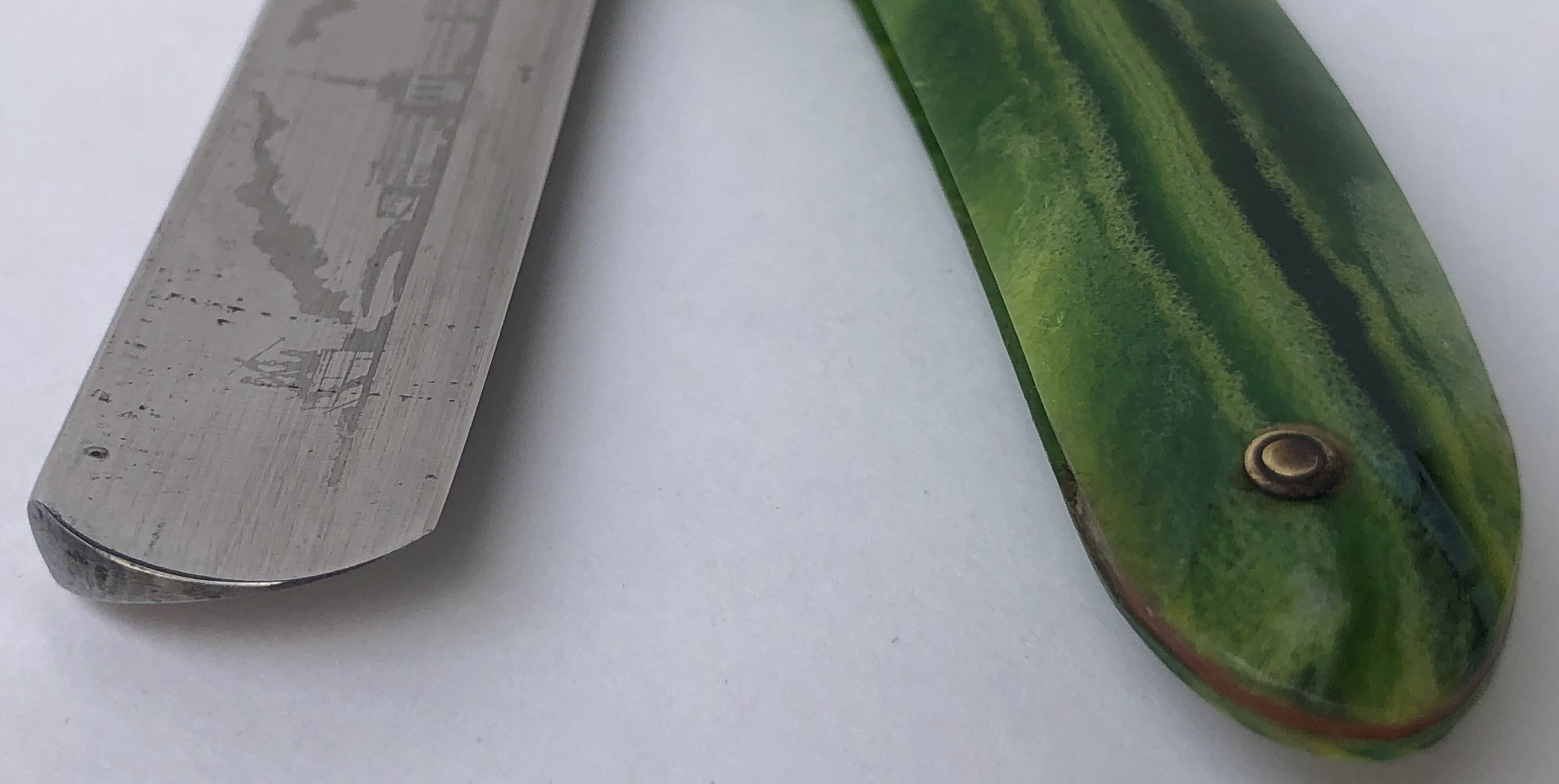 Кто бритву реставрировал и шлифовал полотно, мне не известно. По всей видимости бритва не разбиралась.Шлифовка аккуратная,кромочка ровненькая.Не стал ничего разбирать и чистить в районе осевого пина, но следы времени никоим образом не повлияют на процесс эксплуатации.