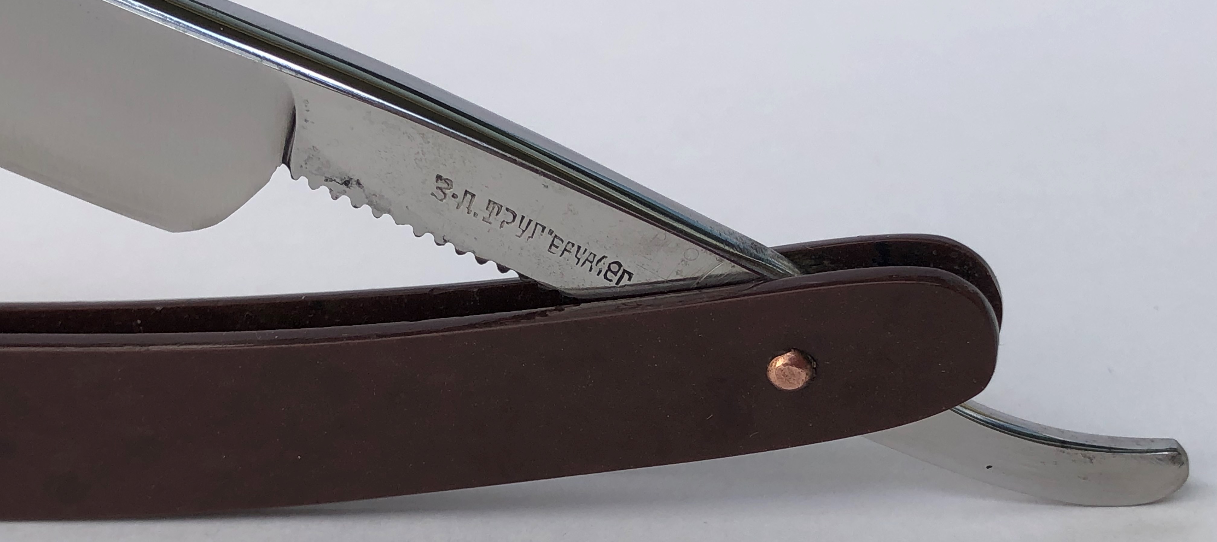 Кто бритву реставрировал и шлифовал полотно, мне не известно. По всей видимости бритва не разбиралась.Шлифовка аккуратная,кромочка ровненькая.Не стал ничего разбирать и чистить в районе осевого пина, но следы времени никоим образом не повлияют на процесс эксплуатации.