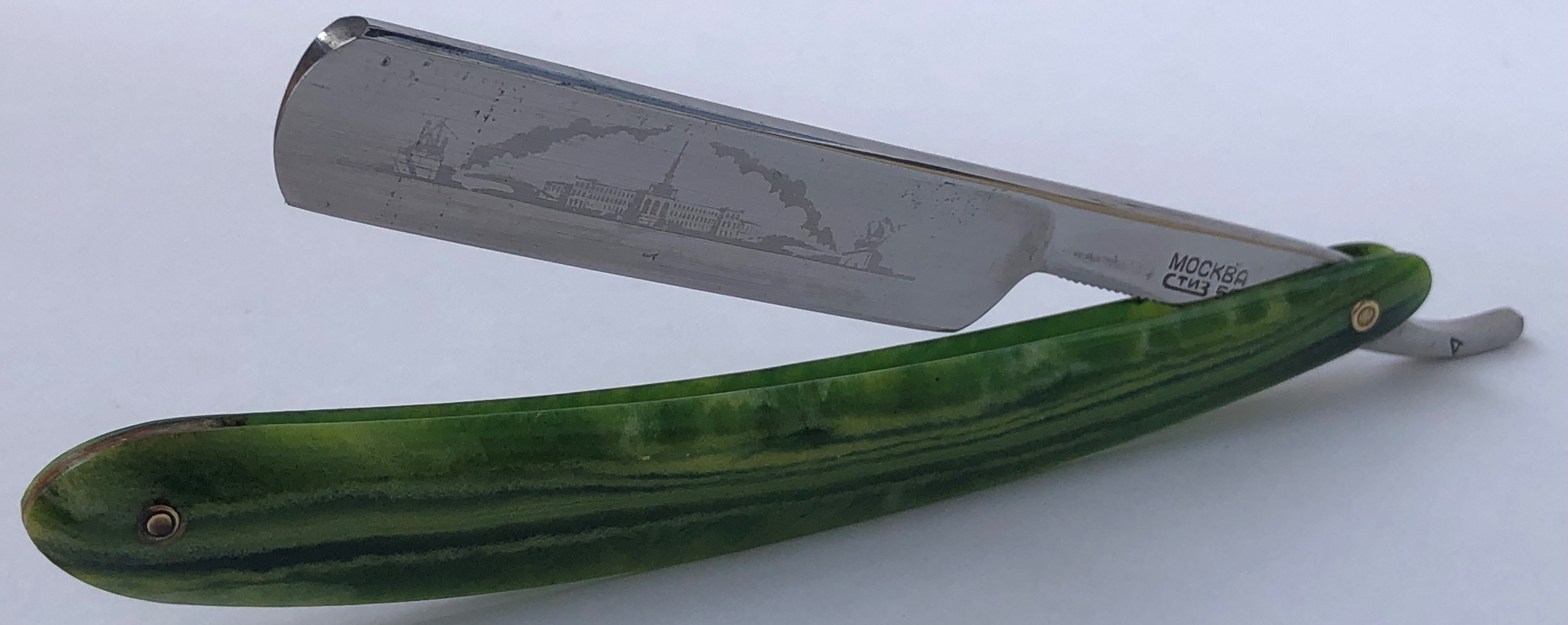 Бритва коллекционного состояния,изначально была с заводской заточкой. Была разобрана, для удаления окисления в районе осевого пина, собрана с добавлением внутренних шайб, а также с сохранением родных пинов.Сталь чистая, без видимых дефектов.Нанесение на полотне четкое, без потертостей.Заводская шлифовка и полировка.Идеальная геометрия клинка. Эффектная ручка цвета малахита. В тон ручки родная коробочка также 1958 года! Идеальный вариант для новичка и в коллекцию.