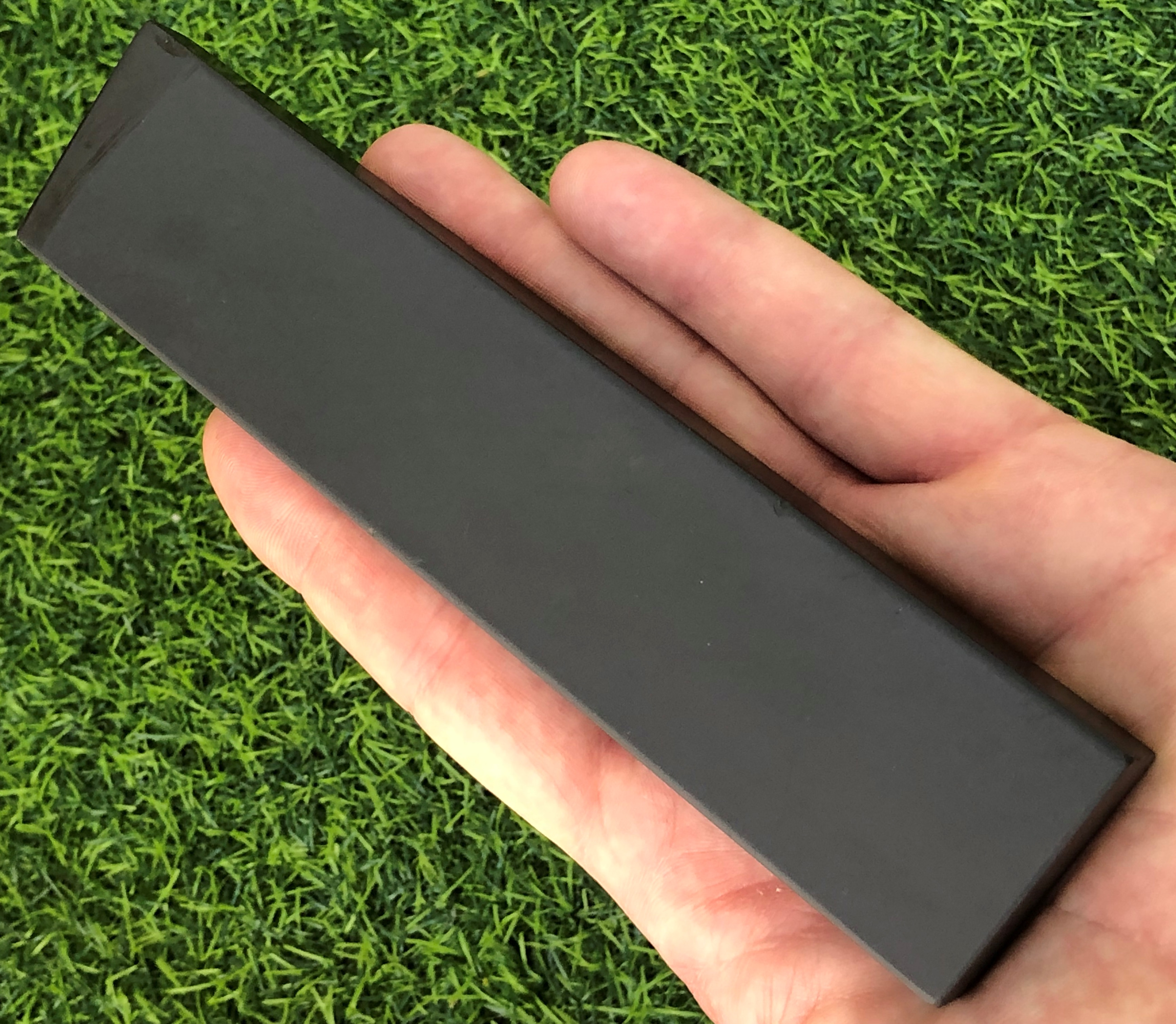 На торце осталась этикетка цвета:темно-синий. Стачала я подучал, что этикетка не родная, но если внимательно посмотреть, то камень представляет собой природно срощенные два слоя:темный оттенок переходит в самый качественный и быстрый(в плане работы) желто-зелёный цвет. Такие двух-слойные образцы можно увидеть на самых топовых и безумно дорогих камнях-barbers delight или "восторг парикмахера".Можно сказать, что за цену обычного 7-дюймового Эшера получаем редкий камень премиум класса.