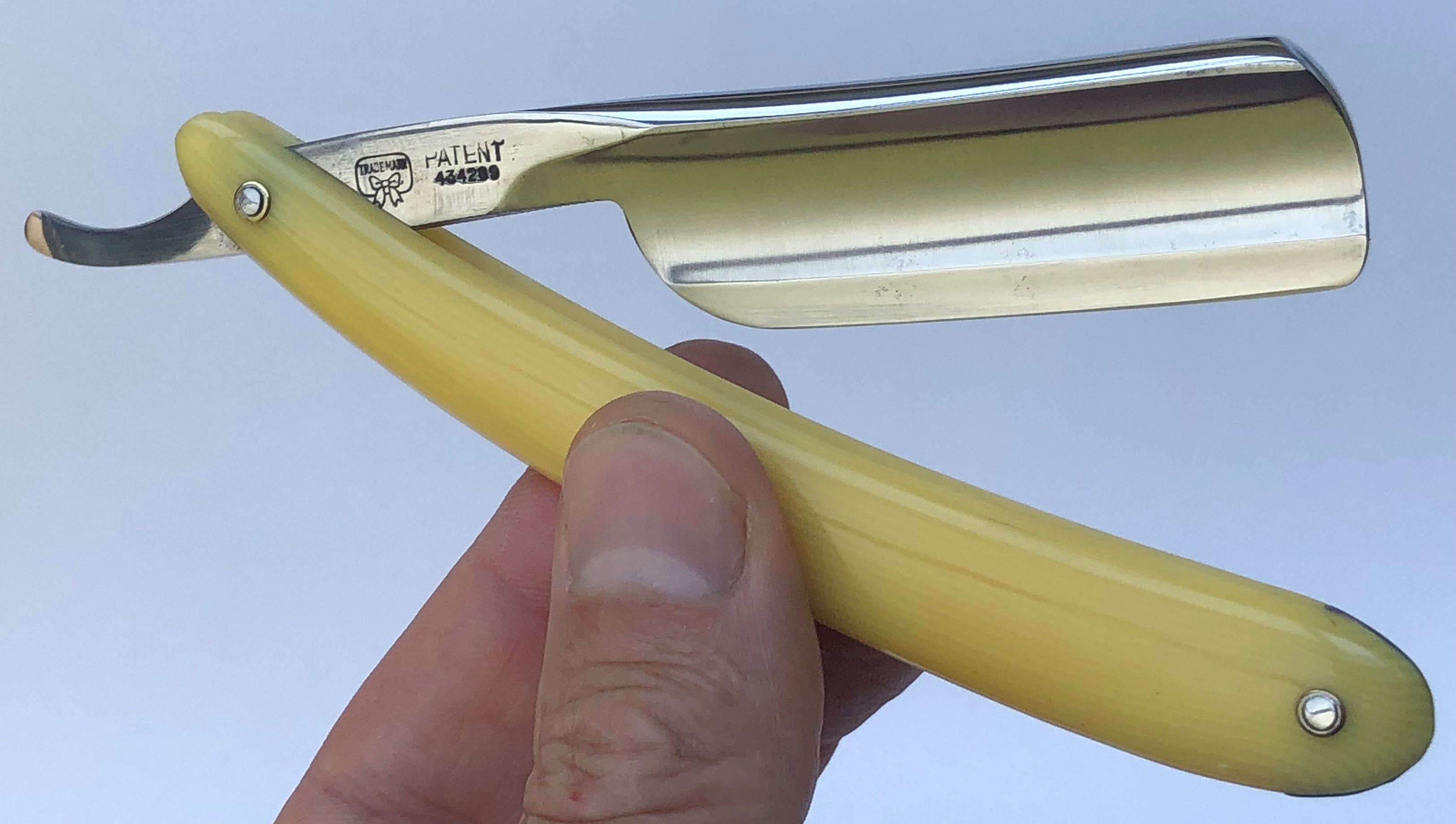 Бритва из набора "7 ДНЕЙ". Исходя из своих наблюдений именно бритвы из таких наборов имели более дорогую комплектацию, в виде оправ из кости или слоновой кости, коробок из ценных пород дерева,а также элегантные формы клинков.