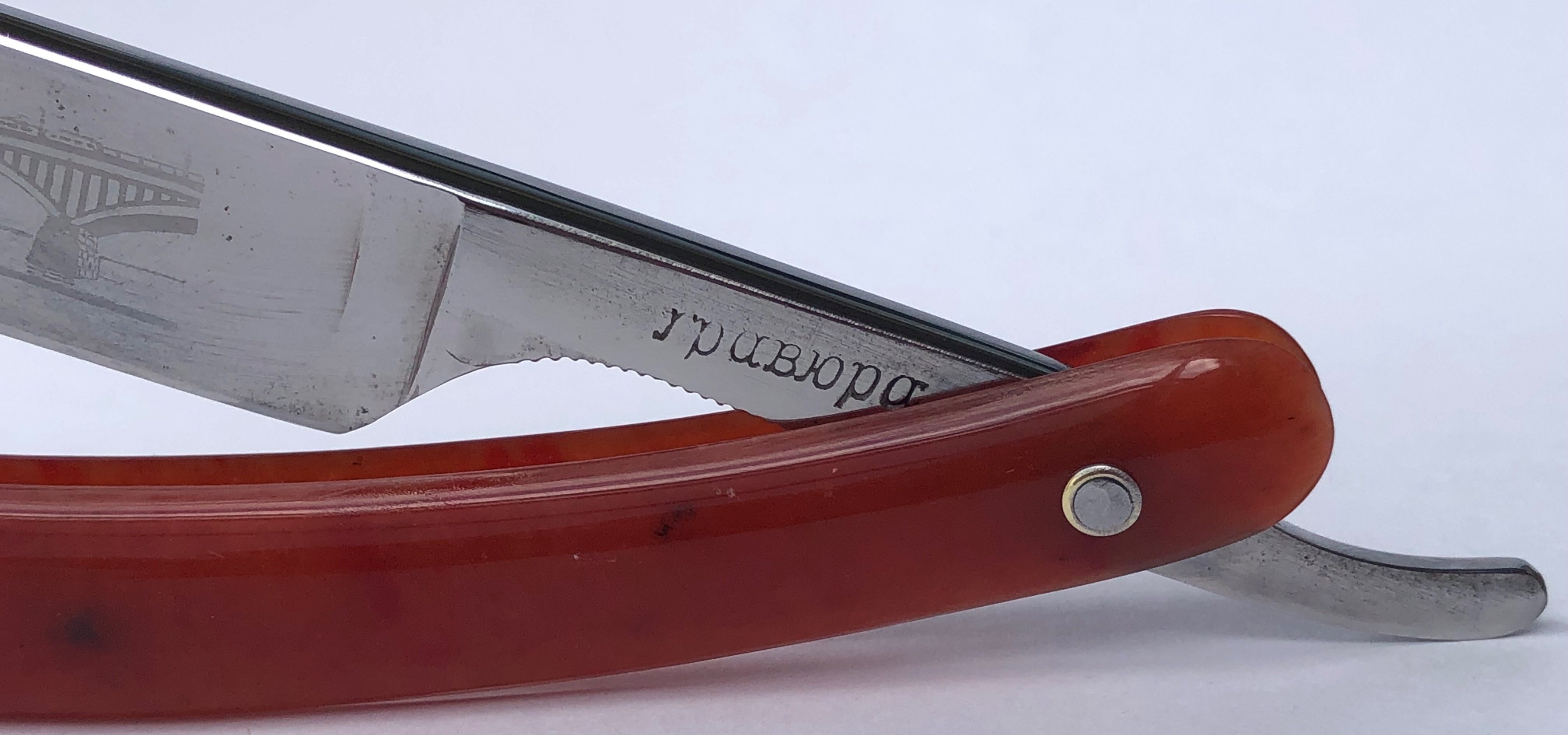 Кто бритву реставрировал и шлифовал полотно, мне не известно. По всей видимости бритва не разбиралась.Шлифовка аккуратная,кромочка ровненькая.Не стал ничего разбирать и чистить в районе осевого пина, но следы времени никоим образом не повлияют на процесс эксплуатации.
