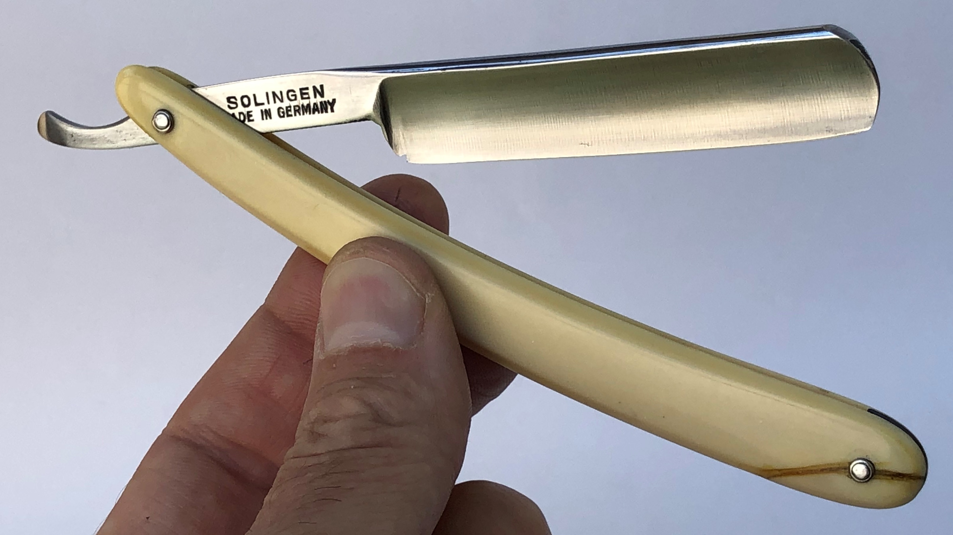 Бритва в очень хорошем состоянии,для своего 100+ летнего возраста. Минимальные следы пользования.Была разобрана для удаления окисления в районе осевого пина. Заводская шлифовка полотна! Умеренно полирнул клинок, для придания былого блеска и все.Трещинку оправы у нижнего пина намертво проклеил.(Хочу обратить внимание, что трещины на слонах и кости это нормальное явление. Все таки натуральный материал).В торце носика клинка присутствует небольшая вмятинка, которая никоим образом не влияет на процесс заточки и бритья.Идеальная геометрия полотна:кромочка равномерна по всей длине. Сталь чистая, без проблем.Немецкие двух-цветные пины.Сама форма лезвия удобна для новичка.Но также сама бритва будет интересна любому любителю клинковой бритвы.