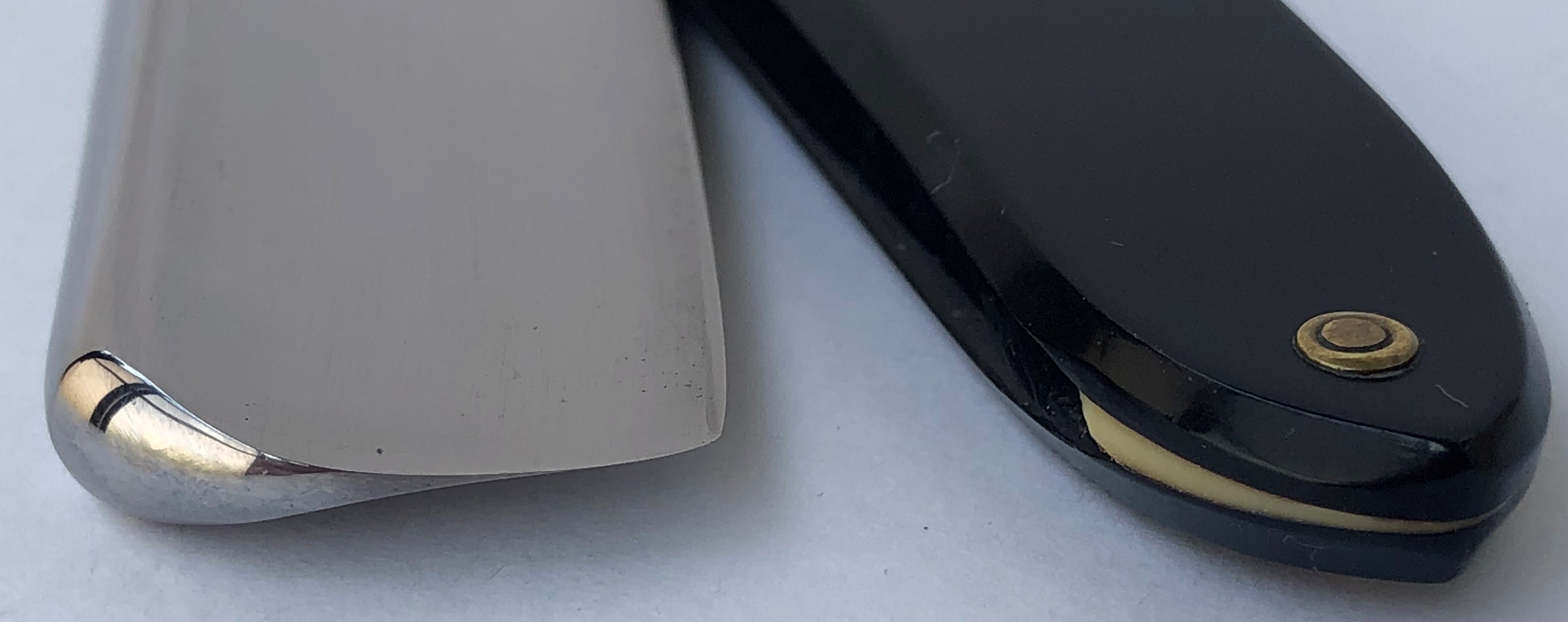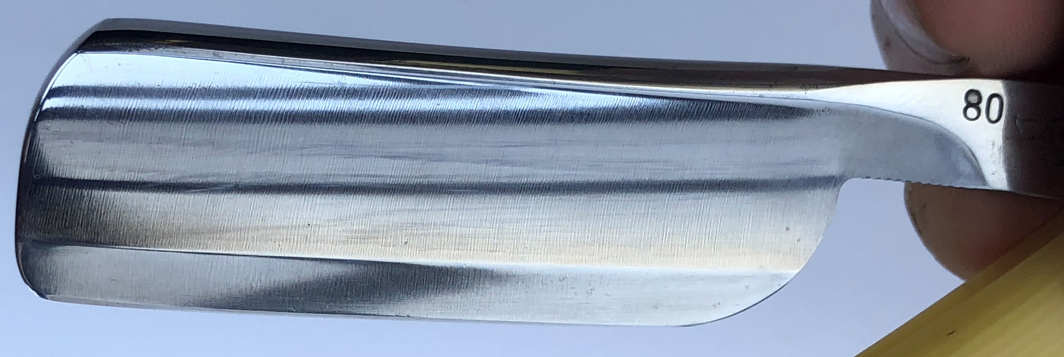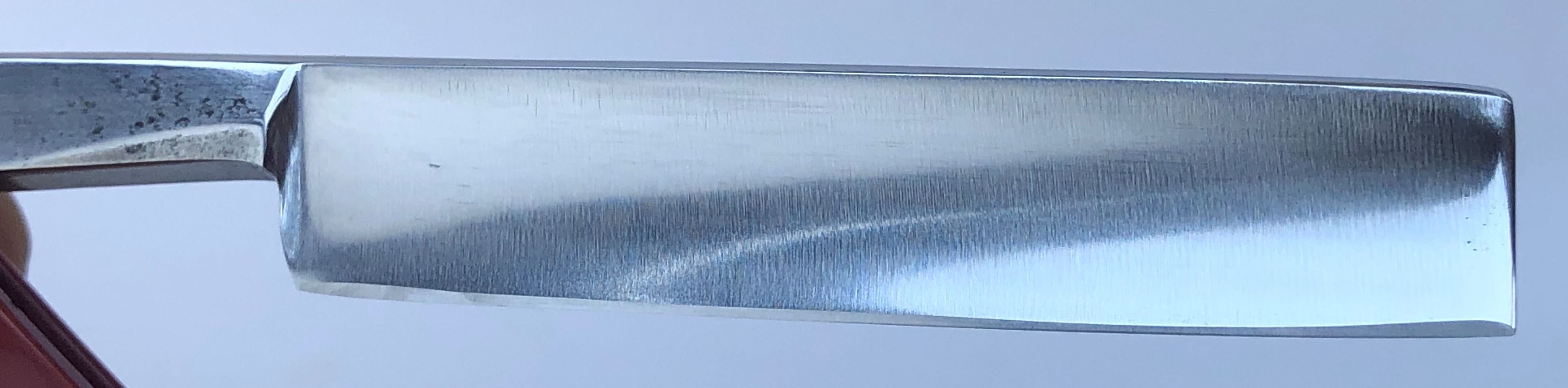 Само полотно на несколько мм укорочено.Было немного освежено от патины, с повторением "родного" характера шлифовки и умеренной полировки.Идеальная геометрия клинка. Сталь чистая, без видимых дефектов.Очень приятная во всех отношениях бритва, достаточно недорогая и если бы не укороченное полотно, то цены бы ей не было...