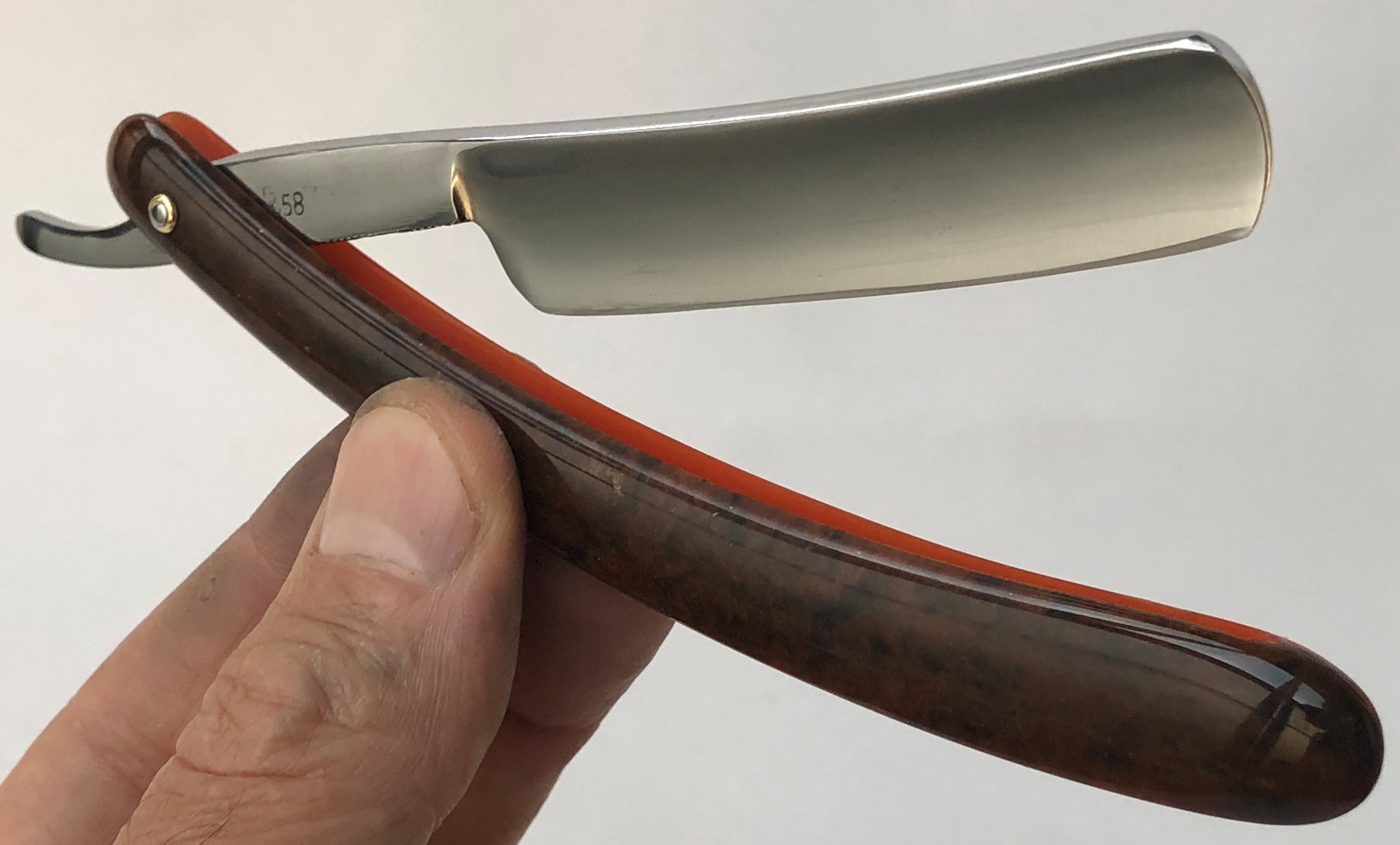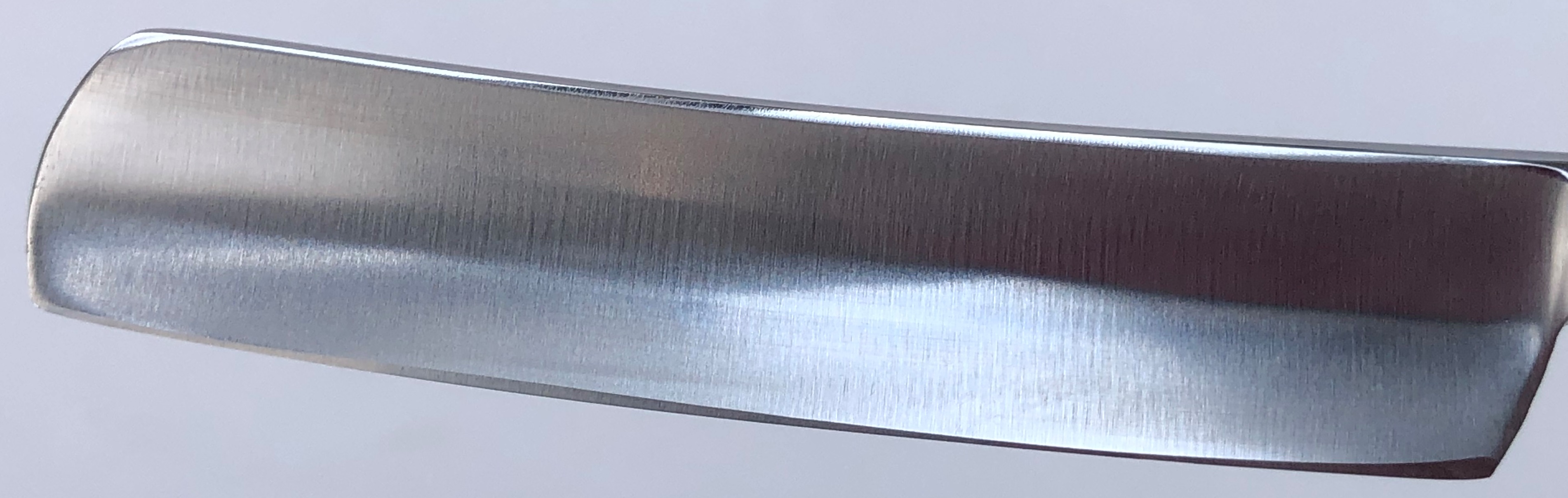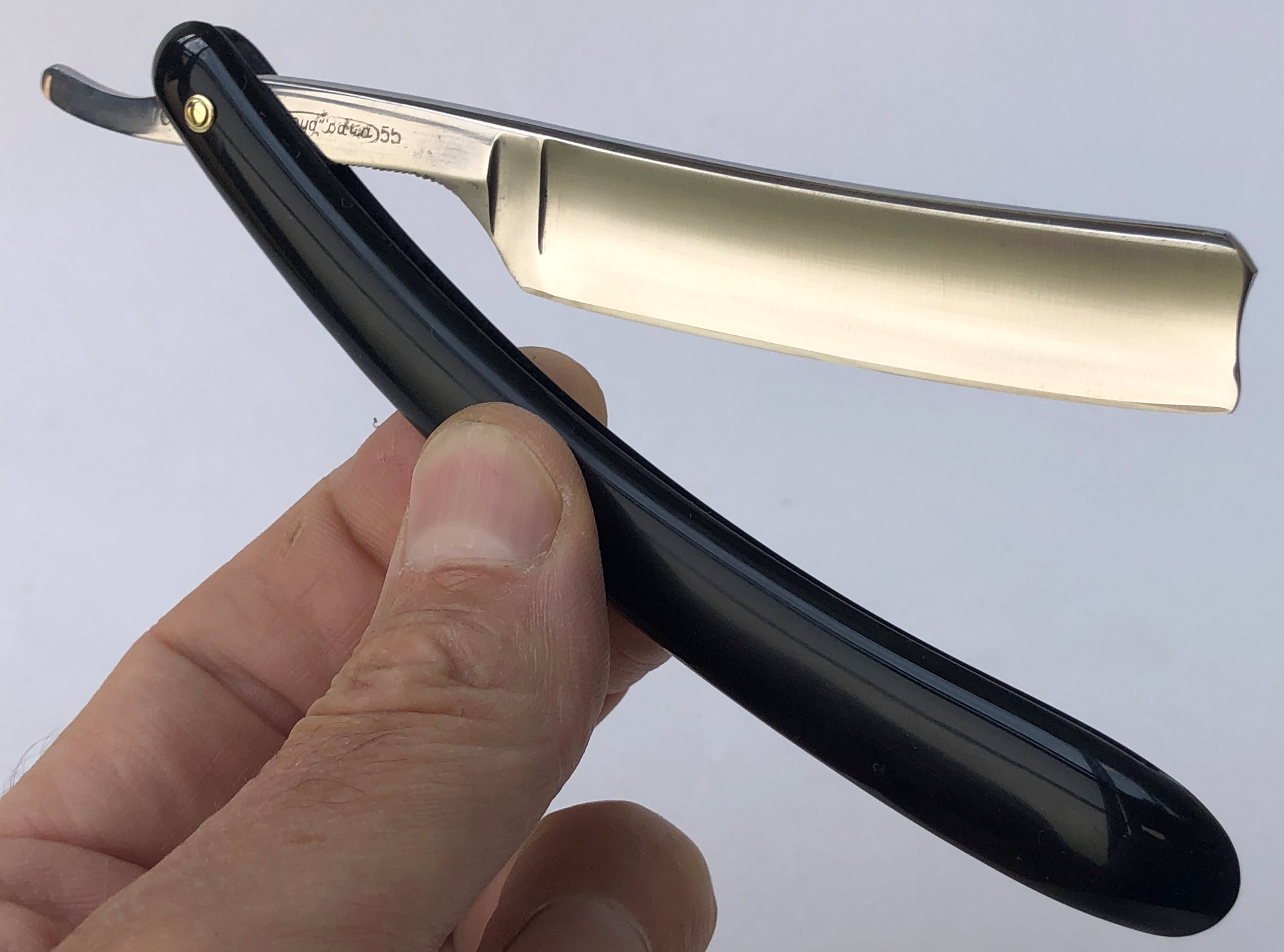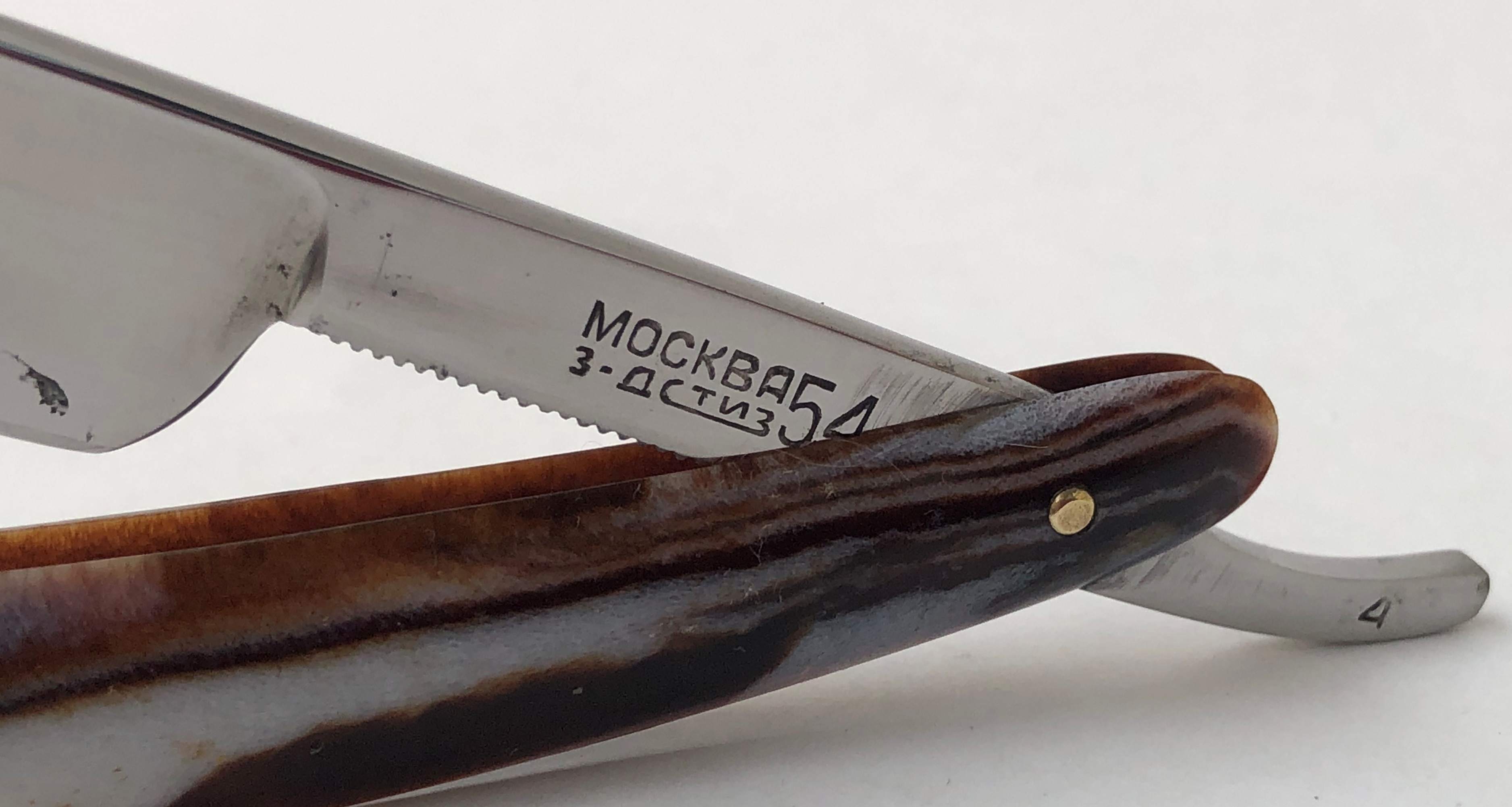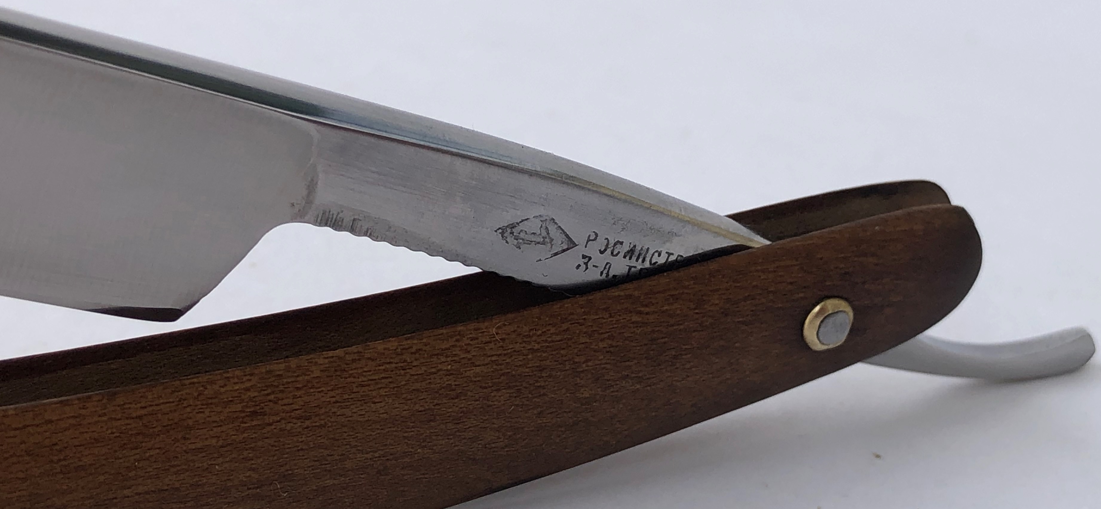 Бритва ручной работы, с элементами ковки.По всей видимости бритва была изготовлена на каком то предприятии мастером-слесарем,либо ещё кем то. Обращает внимание качественная слесарка самого полотна, с правильной и равномерной вогнутостью.Сама скоба обушка также правильной формы и впрессована намертво в тело бритвы.Также впечатлила идеальная геометрия клинка:кромочка равномерна по всей длине.Единственно что мне не то чтобы не понравилось, а как то было сходу неудобно пользоваться, это немного короткий эрль, от осевого до пятки, а также сужение обушка в районе эрля от 3.9 мм до 1.5 мм снизу.На качество бритья никак не влияет, просто нужно привыкать, как и к любой неординарной бритве.