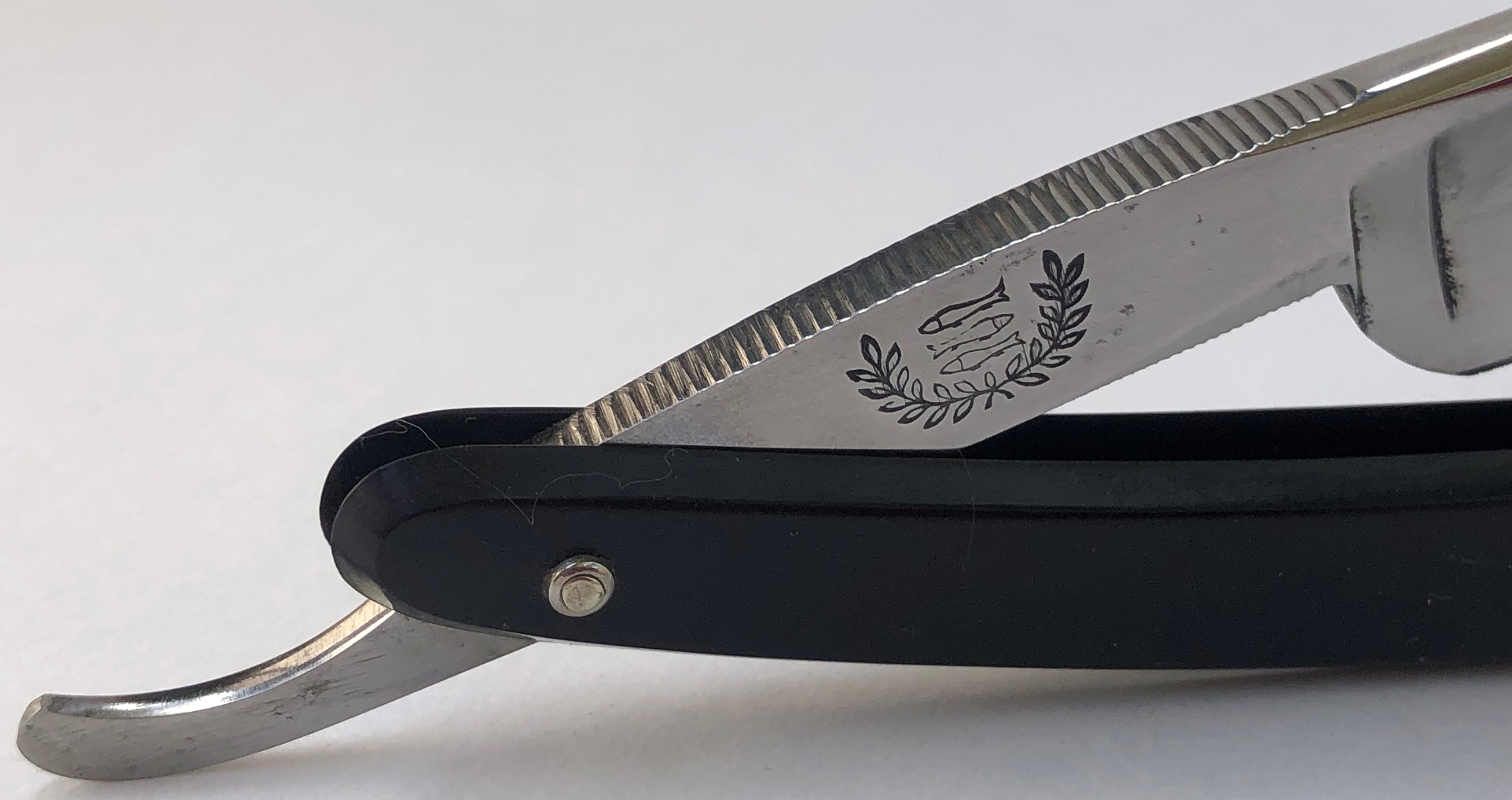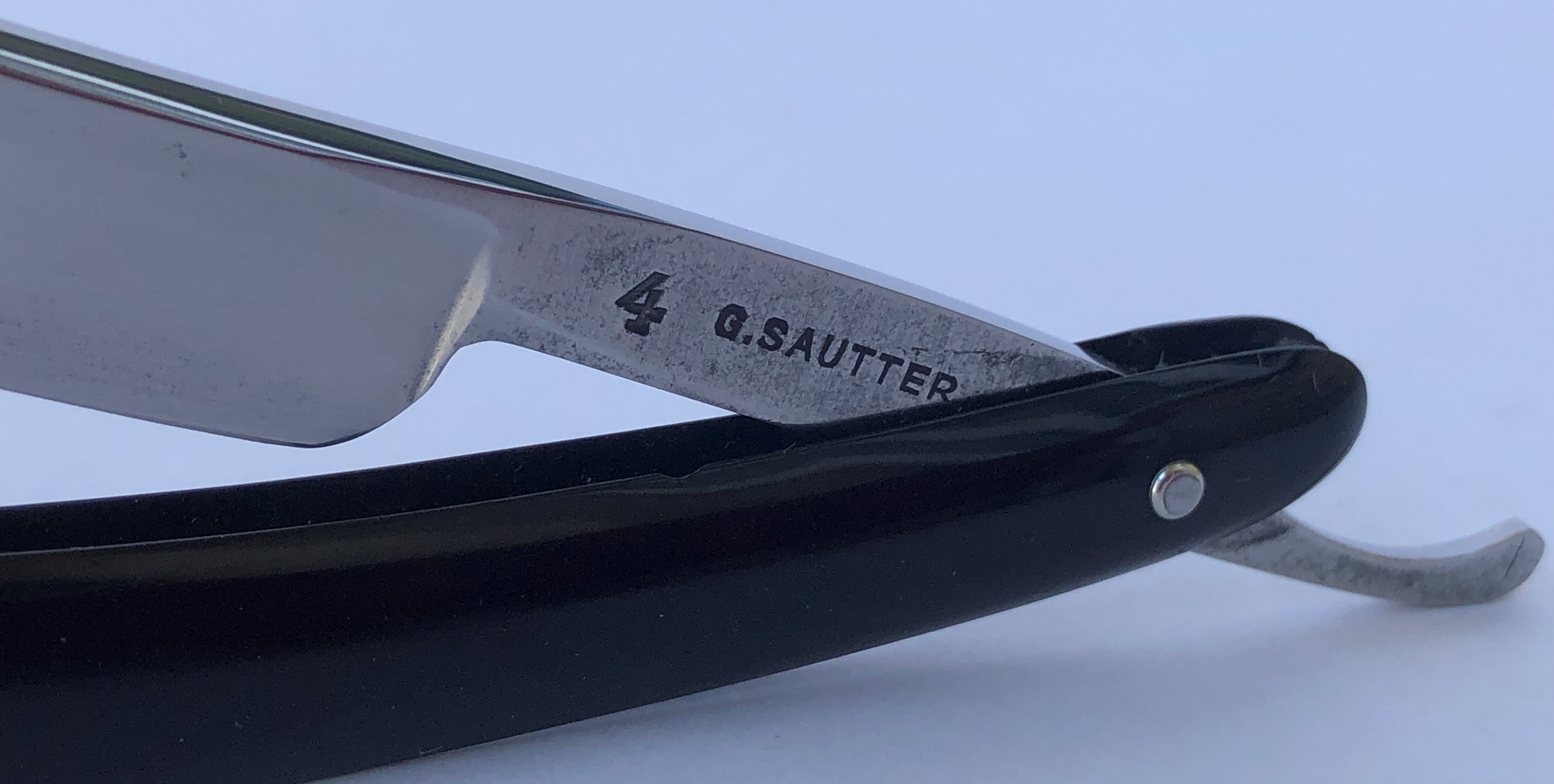 Бритва была разобрана и многолетняя патина была убрана, путем ручной шлифовки на камнях, по принципу шлифовки катан.Шлифовка полотна до 800 грит и полировка.Следы ковки на эрле оставил, как , по всей видимости было и задумано мастером.Поставил немецкие пины и добавил внутренние шайбы.