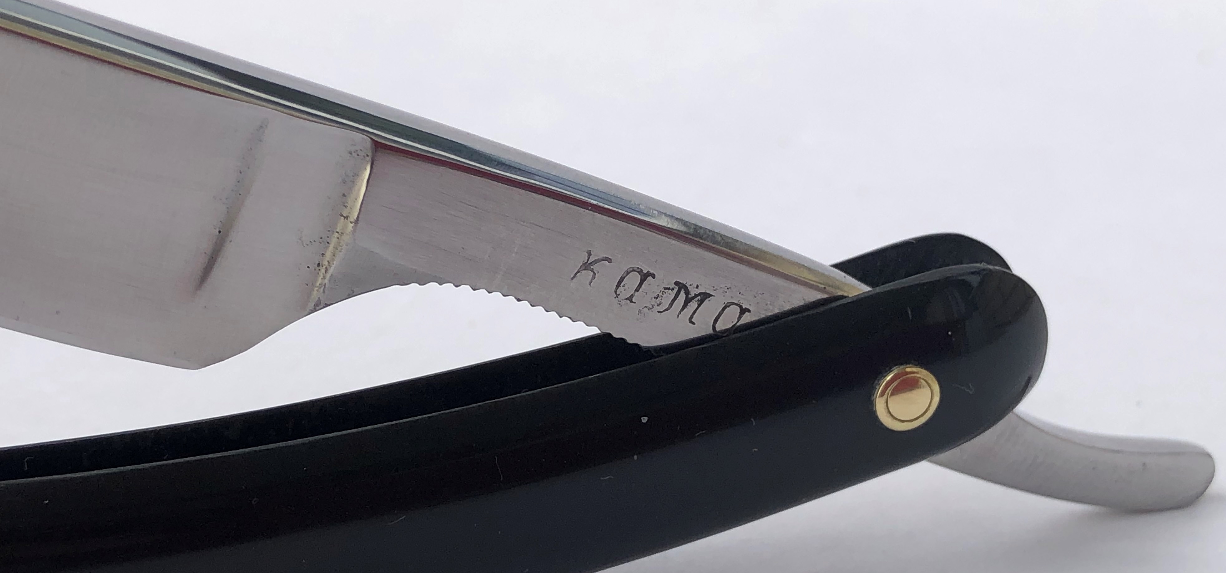 Бритва в очень хорошем состоянии.Аккуратное пользование и заточка, со знанием дела. Была разобрана, чтобы убрать небольшие очаги коррозии в районе осевого пина и обушка.Перешлифовка и переполировка клинка.Пластиковые накладки целые, без трещин и деформации.Очень удобная и эффектная вещь.Кромочка равномерна пов сей длине.Добавил внутренние шайбы, для порядка.Двух-цветные пины.Бритва заточена и готова к бритью.