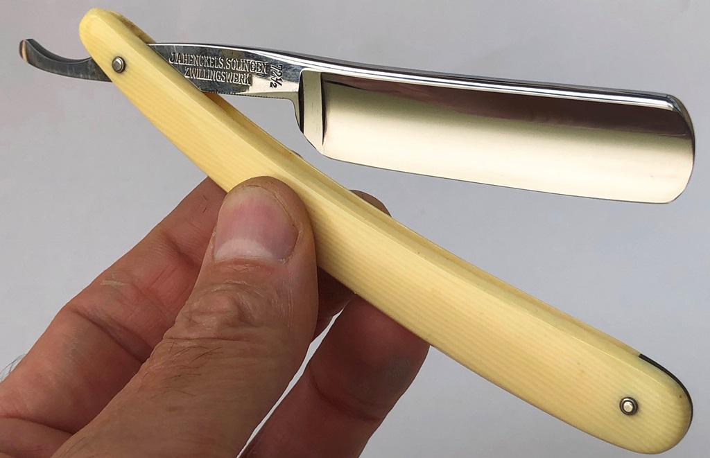 Бритва без следов пользования. Ничего не разбиралось и не ремонтировалось. Оригинальная шлифовка и полировка.Клинок не имеет видимых дефектов.Идеальная геометрия полотна:кромочка равномерна по всей длине.Чёткая гравировка, без потёртостей."Бомбическая" трёх-пиновая, пластиковая оправа, цвета "слоновой кости", с эффектными металлическими накладками , в районе двух пинов.