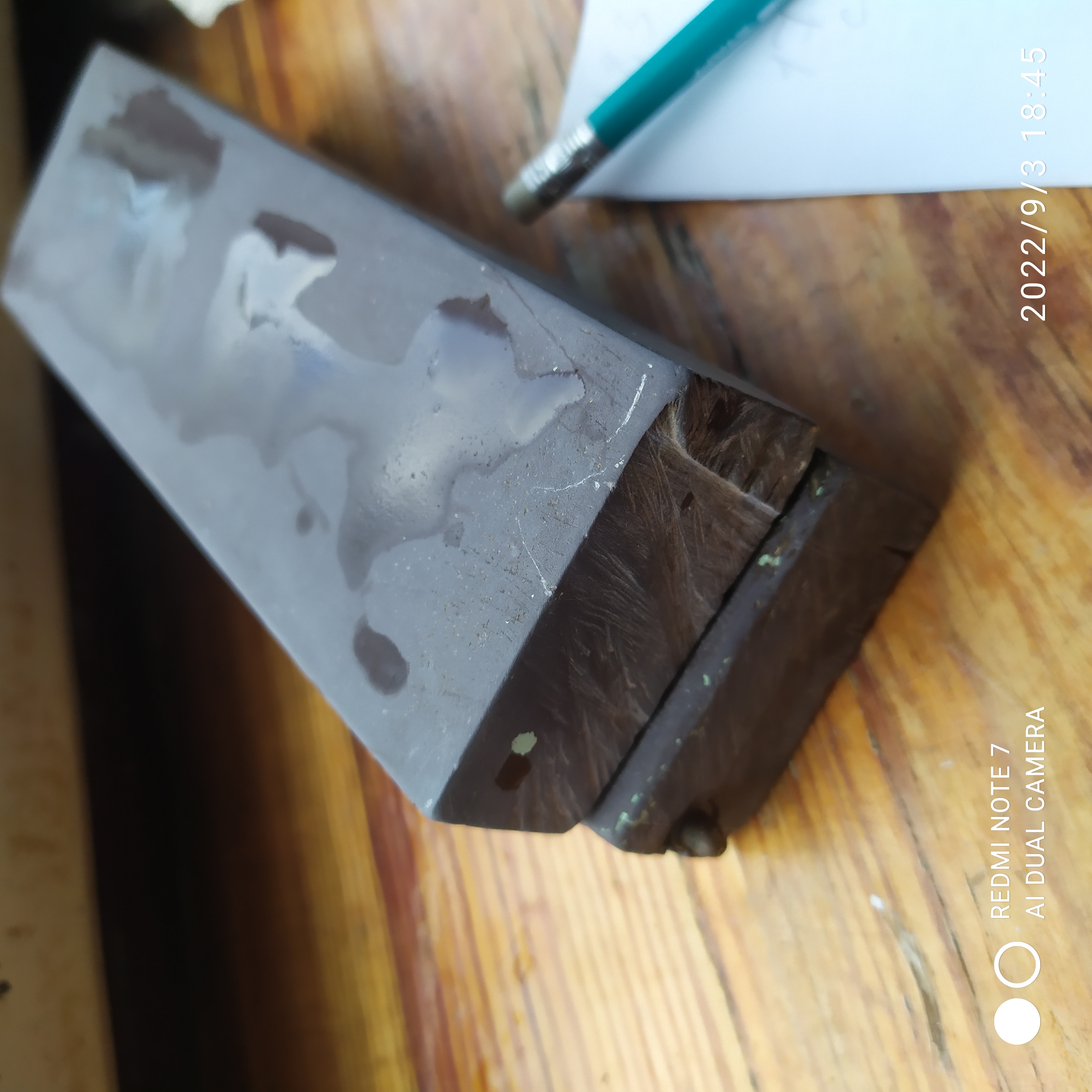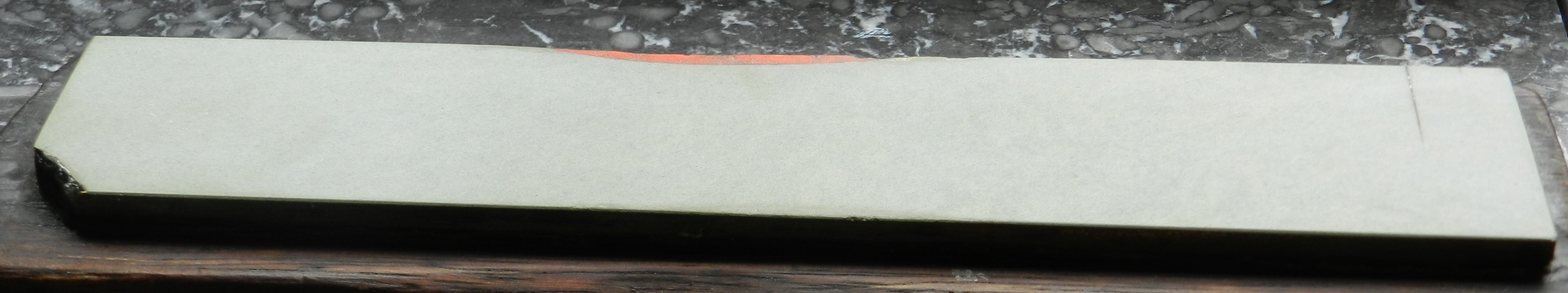 Приобрёл вот такой старый камень на борде. Похоже на классический сланец для доводки бритв. Размеры 20,5см х 4см. Очень долго доводил на Атоме 600, седло было приличное. Цвет светло серый/зеленоватый. На ощупь крайне гладкий, суспензия почти белая, твёрже чем мой жёлтый котикул (но всё же суспензию даёт без проблем). С края, заметен выход красного твёрдого камня. Доводил на нём пару бритв - результатом очень доволен. Что это за порода по вашему мнению?