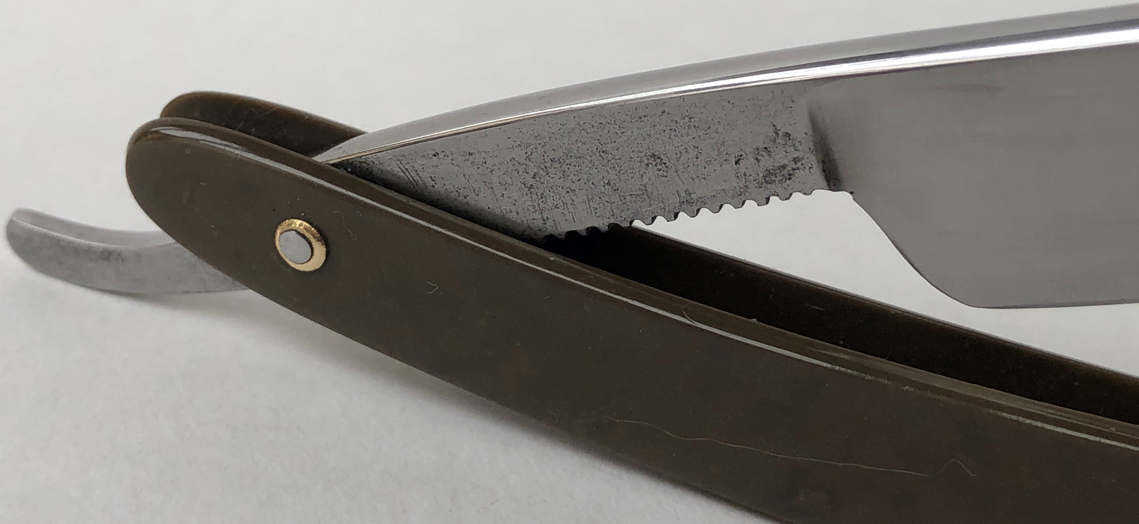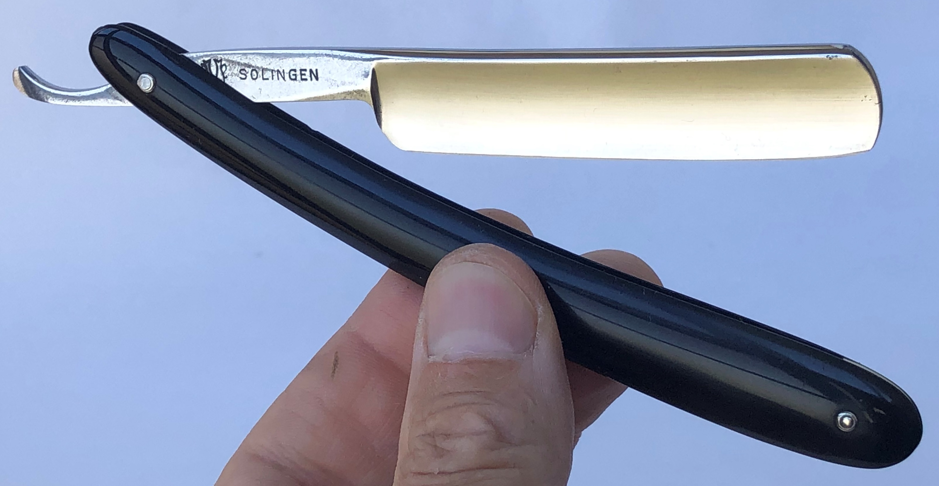 Бритва была разобрана и многолетняя патина была убрана, путем ручной шлифовки на камнях, по принципу шлифовки катан.Шлифовка полотна до 800 грит и полировка.Следы ковки на эрле оставил, как , по всей видимости было и задумано мастером.Поставил немецкие пины и добавил внутренние шайбы.