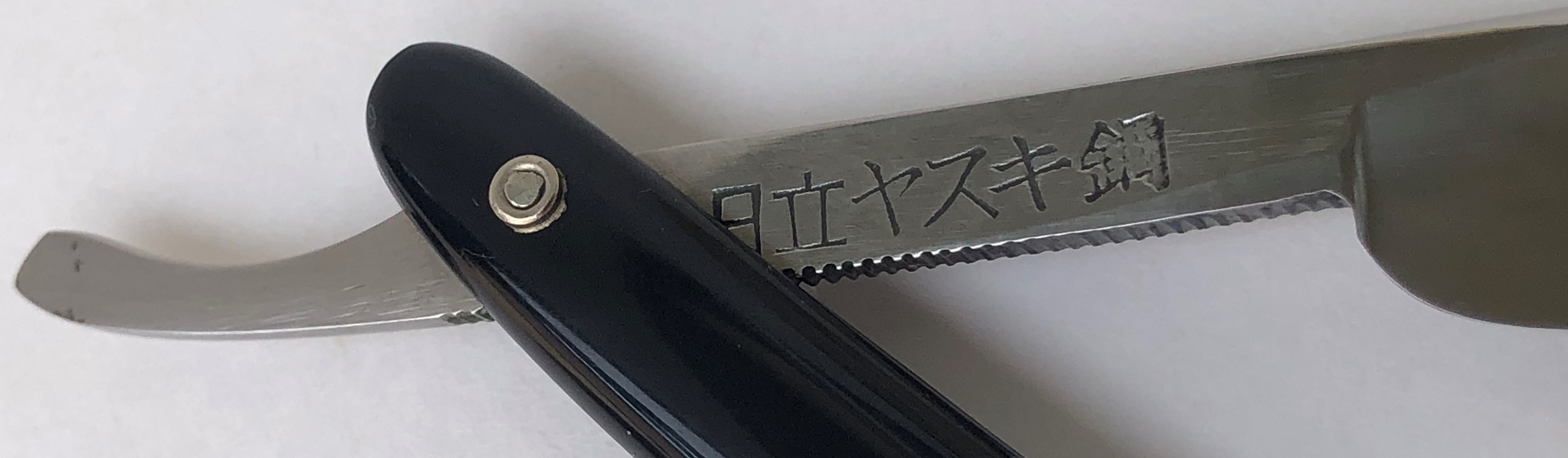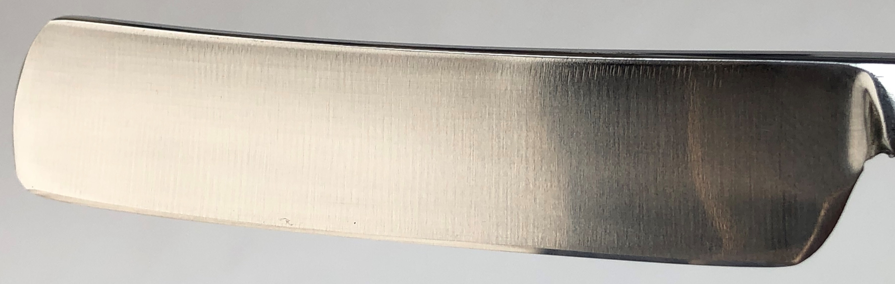 Бритва ручной работы, с элементами ковки.По всей видимости бритва была изготовлена на каком то предприятии мастером-слесарем,либо ещё кем то. Обращает внимание качественная слесарка самого полотна, с правильной и равномерной вогнутостью.Сама скоба обушка также правильной формы и впрессована намертво в тело бритвы.Также впечатлила идеальная геометрия клинка:кромочка равномерна по всей длине.Единственно что мне не то чтобы не понравилось, а как то было сходу неудобно пользоваться, это немного короткий эрль, от осевого до пятки, а также сужение обушка в районе эрля от 3.9 мм до 1.5 мм снизу.На качество бритья никак не влияет, просто нужно привыкать, как и к любой неординарной бритве.