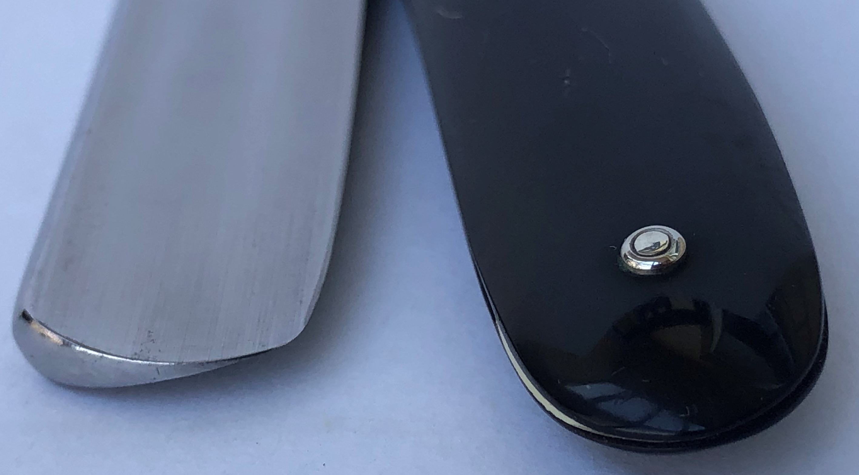 Бритва в очень хорошем состоянии.Аккуратное пользование и заточка, со знанием дела. Была разобрана, чтобы убрать небольшие очаги коррозии в районе осевого пина и обушка.Перешлифовка и переполировка клинка.Пластиковые накладки целые, без трещин и деформации.Очень удобная и эффектная вещь.Кромочка равномерна пов сей длине.Добавил внутренние шайбы, для порядка.Двух-цветные пины.Бритва заточена и готова к бритью.