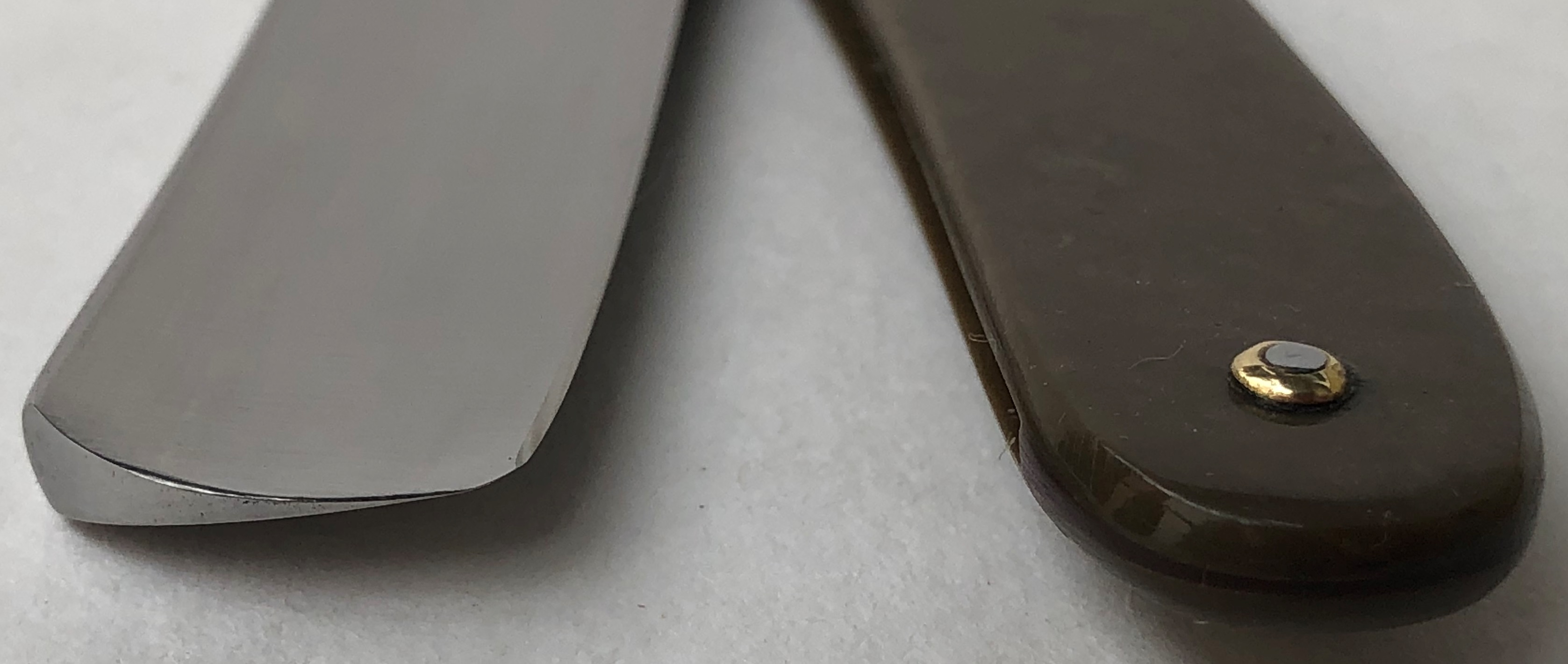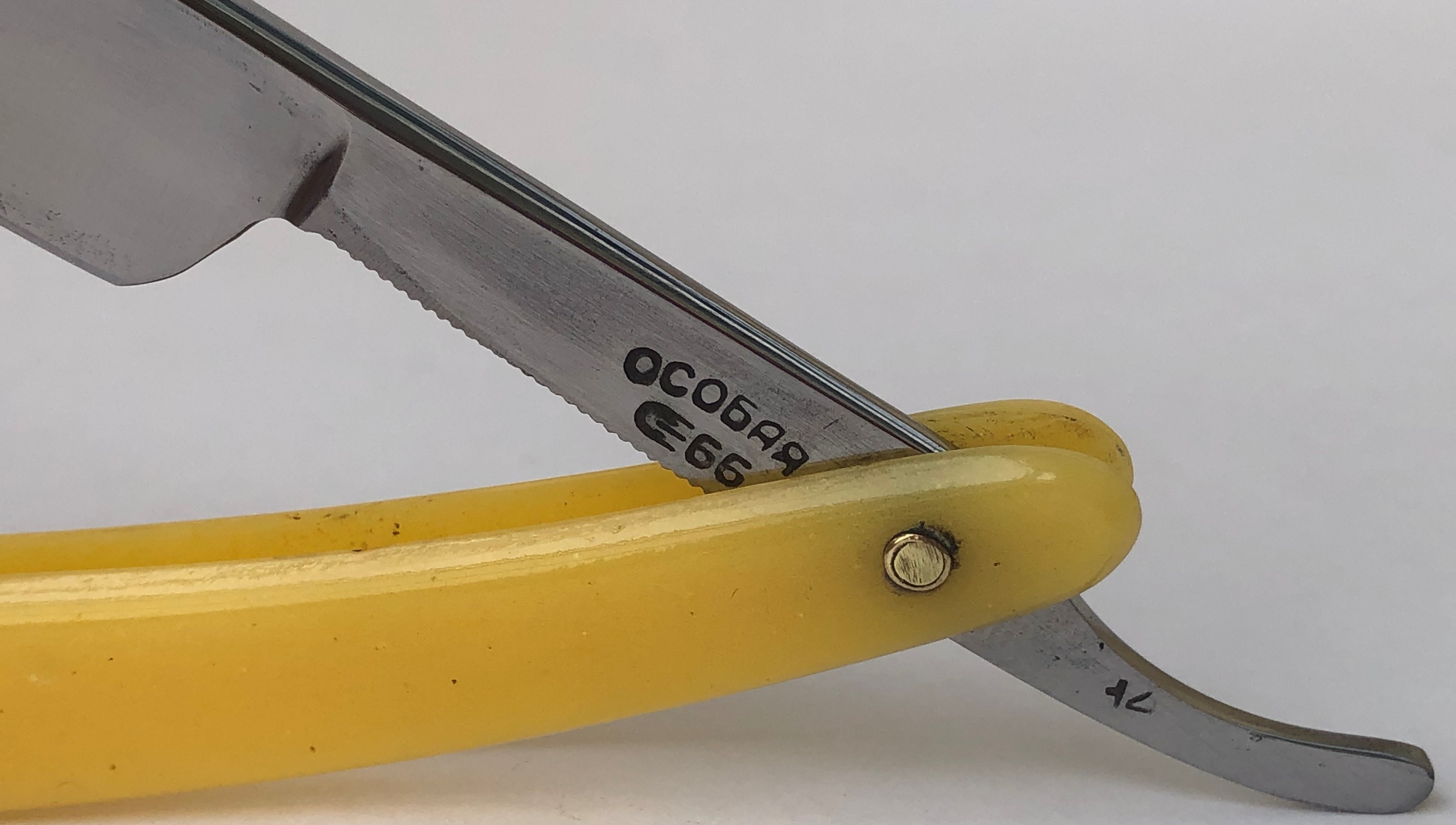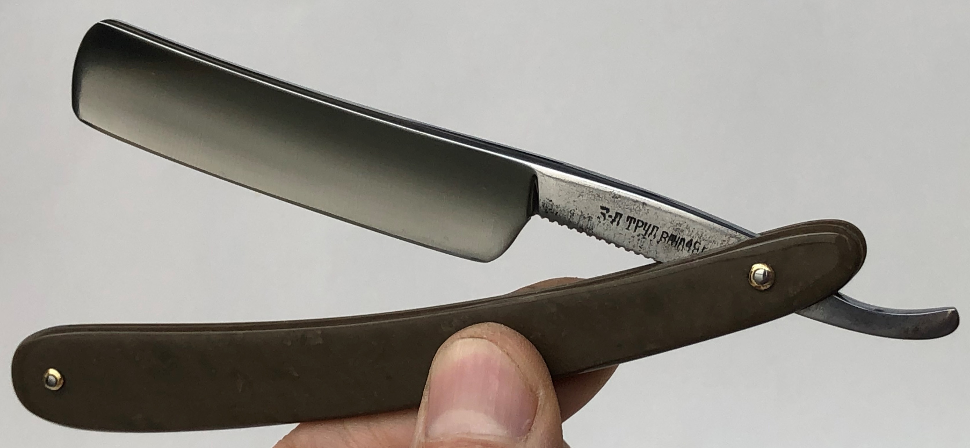 Бритва ручной работы, с элементами ковки.По всей видимости бритва была изготовлена на каком то предприятии мастером-слесарем,либо ещё кем то. Обращает внимание качественная слесарка самого полотна, с правильной и равномерной вогнутостью.Сама скоба обушка также правильной формы и впрессована намертво в тело бритвы.Также впечатлила идеальная геометрия клинка:кромочка равномерна по всей длине.Единственно что мне не то чтобы не понравилось, а как то было сходу неудобно пользоваться, это немного короткий эрль, от осевого до пятки, а также сужение обушка в районе эрля от 3.9 мм до 1.5 мм снизу.На качество бритья никак не влияет, просто нужно привыкать, как и к любой неординарной бритве.