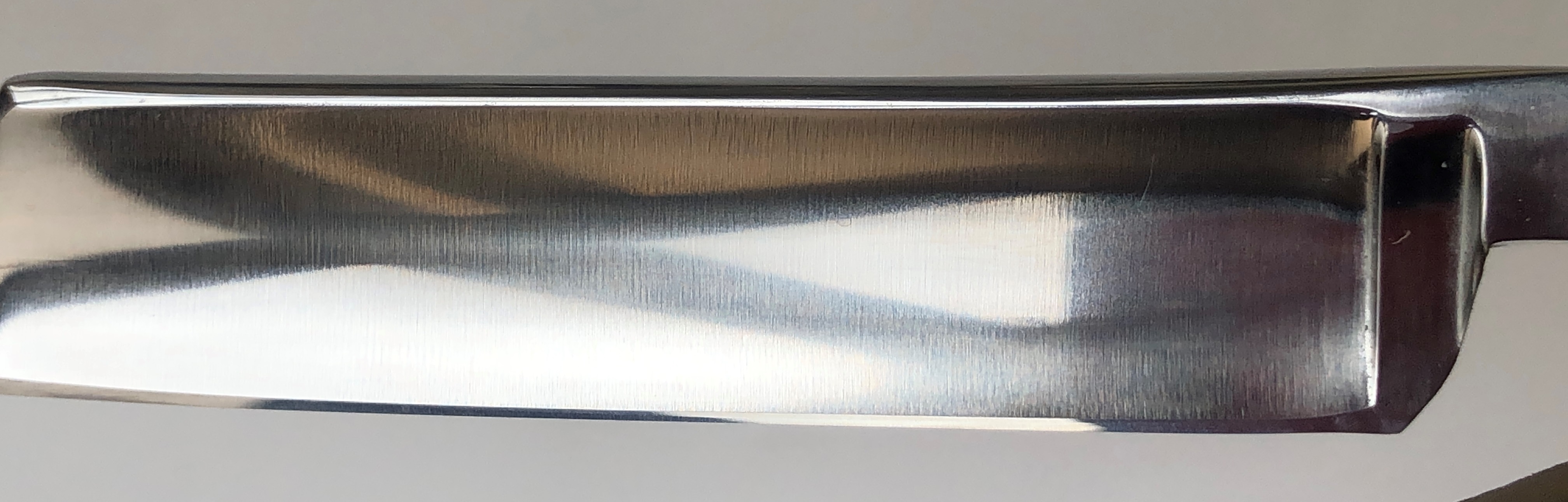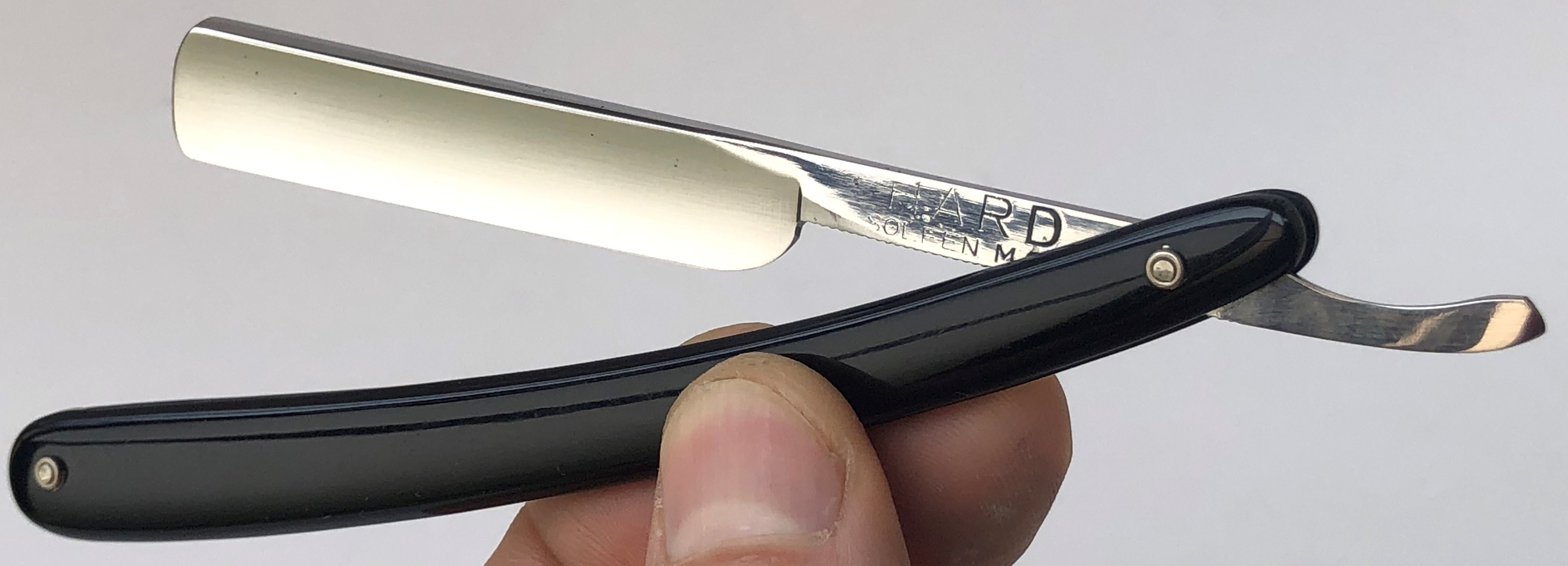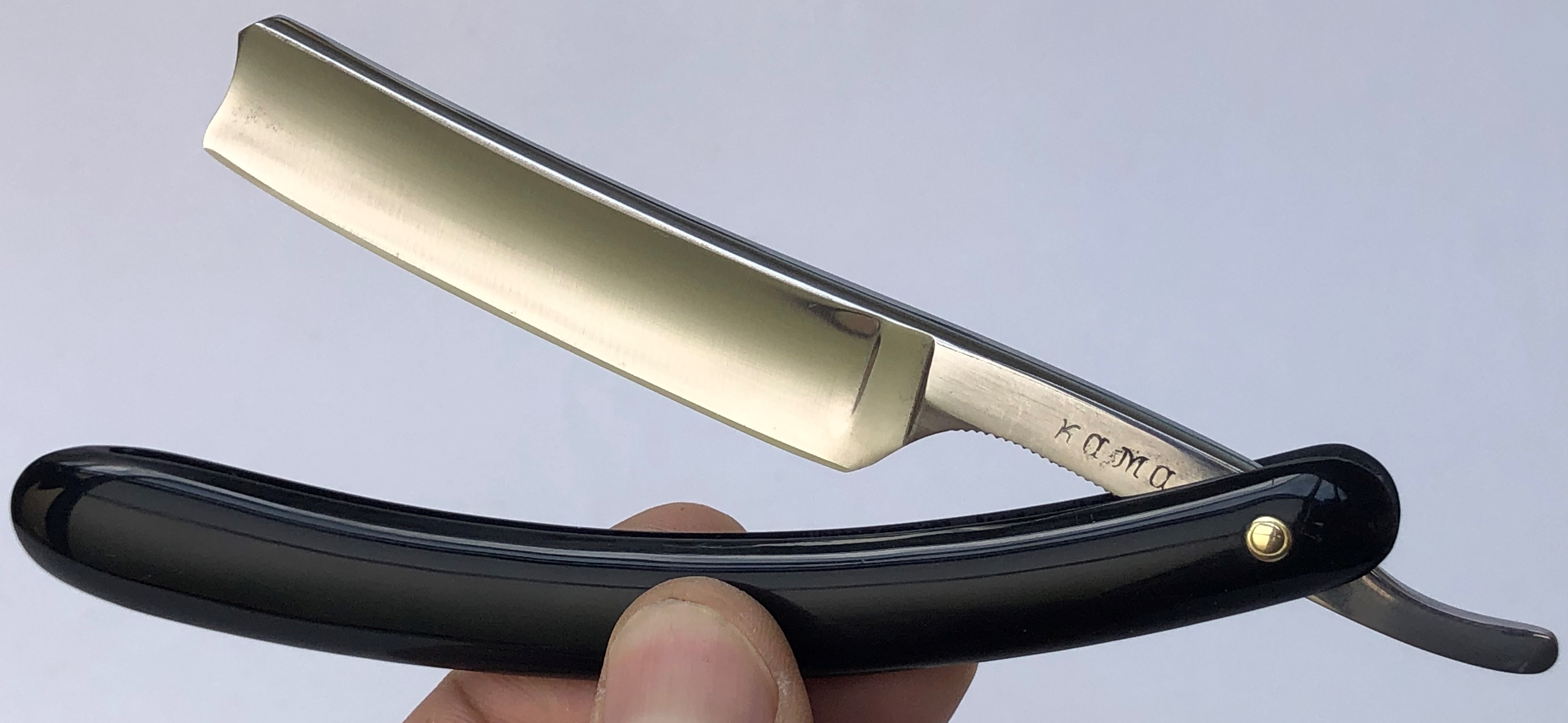 Бритва ручной работы, с элементами ковки.По всей видимости бритва была изготовлена на каком то предприятии мастером-слесарем,либо ещё кем то. Обращает внимание качественная слесарка самого полотна, с правильной и равномерной вогнутостью.Сама скоба обушка также правильной формы и впрессована намертво в тело бритвы.Также впечатлила идеальная геометрия клинка:кромочка равномерна по всей длине.Единственно что мне не то чтобы не понравилось, а как то было сходу неудобно пользоваться, это немного короткий эрль, от осевого до пятки, а также сужение обушка в районе эрля от 3.9 мм до 1.5 мм снизу.На качество бритья никак не влияет, просто нужно привыкать, как и к любой неординарной бритве.