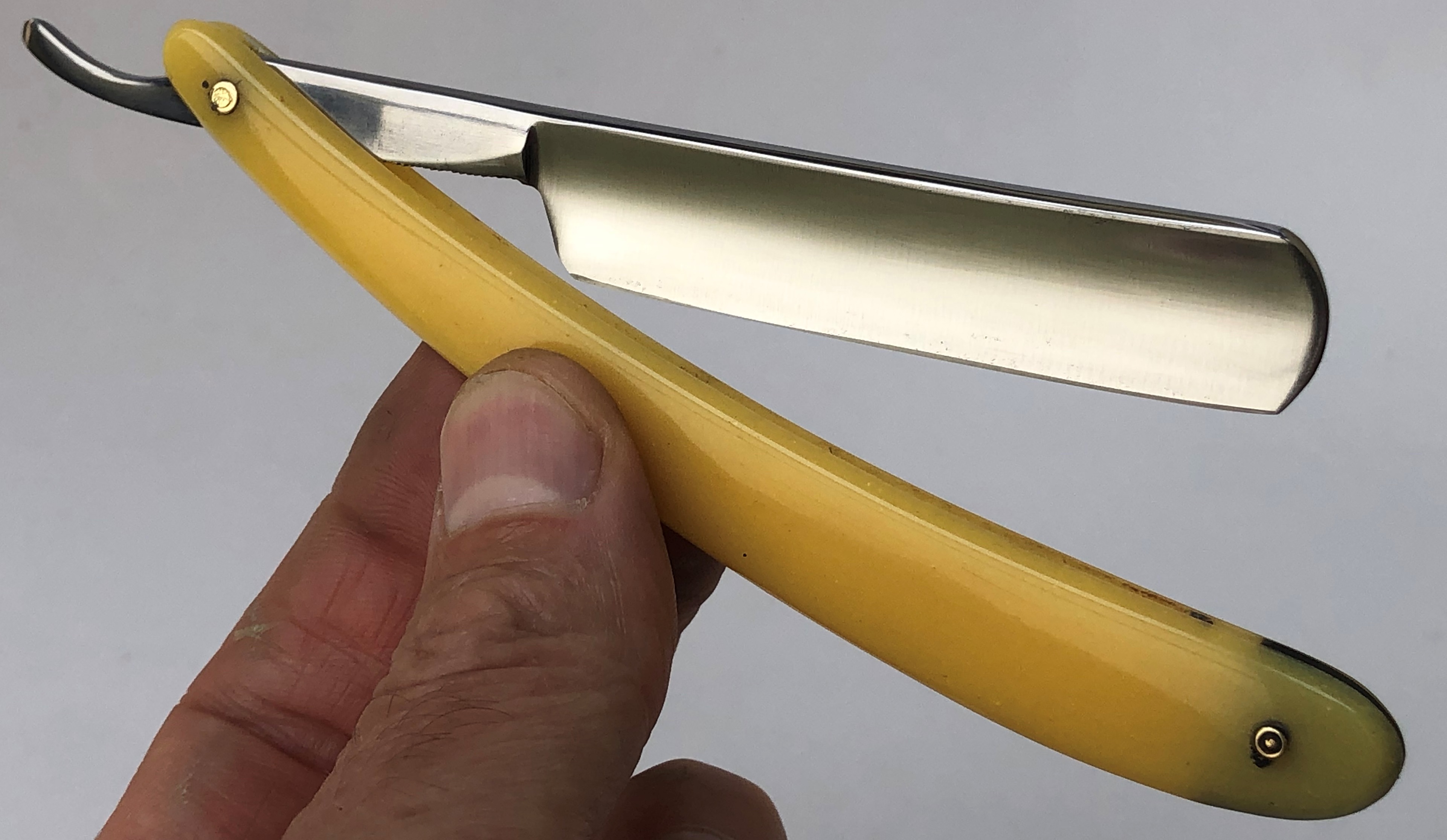 Бритва с прекрасном состоянии, без активных следов пользования.Все оригинальное.Ничего не разбиралось и не ремонтировалось.Сталь и кромочка чистые, без видимых дефектов.Очень хороший и относительно недорогой вариант для новичка. Удобная форма и размер бритвы для обучения всем премудростям классического бритья. Заточена и готова к бритью.